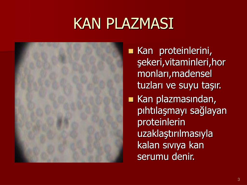 KAN PLAZMASI • Kan proteinlerini, şekeri,vitaminleri,hormonları,madensel tuzları ve suyu taşır. • Kan plazmasından, pıhtılaşmayı sağlayan proteinlerin uzaklaştırılmasıyla kalan sıvıya kan serumu denir. 3 SağlıkSlaytları <a href=“http://hastaneciyiz.blogspot.com”>sağlık</a>