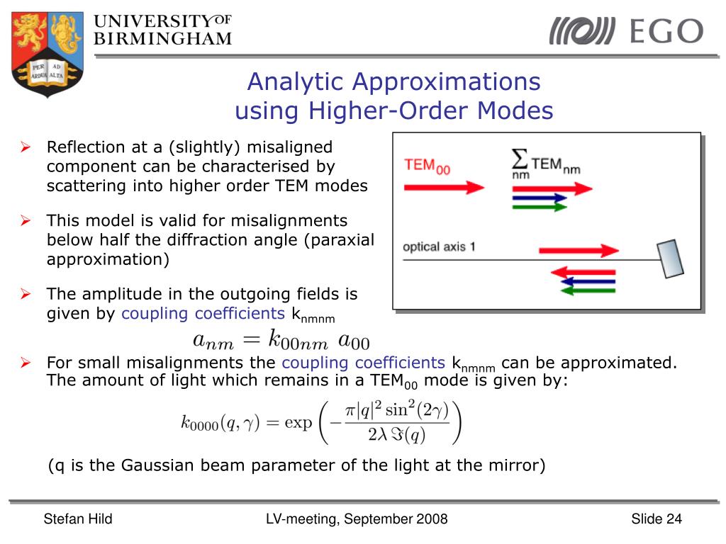 Analytic Approximations using Higher-Order Modes • Reflection at a (slightly) misaligned component can be characterised by scattering into higher order TEM modes • This model is valid for misalignments below half the diffraction angle (paraxial approximation) • The amplitude in the outgoing fields is given by coupling coefficients knmnm • For small misalignments the coupling coefficients knmnm can be approximated. The amount of light which remains in a TEM00 mode is given by: (q is the Gaussian beam parameter of the light at the mirror) LV-meeting, September 2008