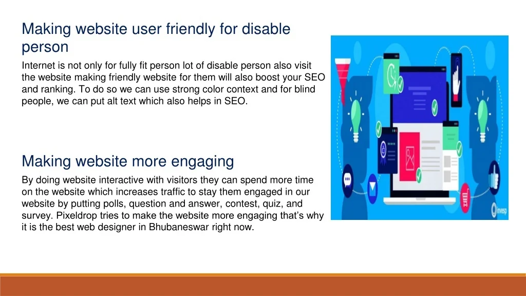 Making website user friendly for disable person Internet is not only for fully fit person lot of disable person also visit the website making friendly website for them will also boost your SEO and ranking. To do so we can use strong color context and for blind people, we can put alt text which also helps in SEO. Making website more engaging By doing website interactive with visitors they can spend more time on the website which increases traffic to stay them engaged in our website by putting polls, question and answer, contest, quiz, and survey. Pixeldrop tries to make the website more engaging that’s why it is the best web designer in Bhubaneswar right now.