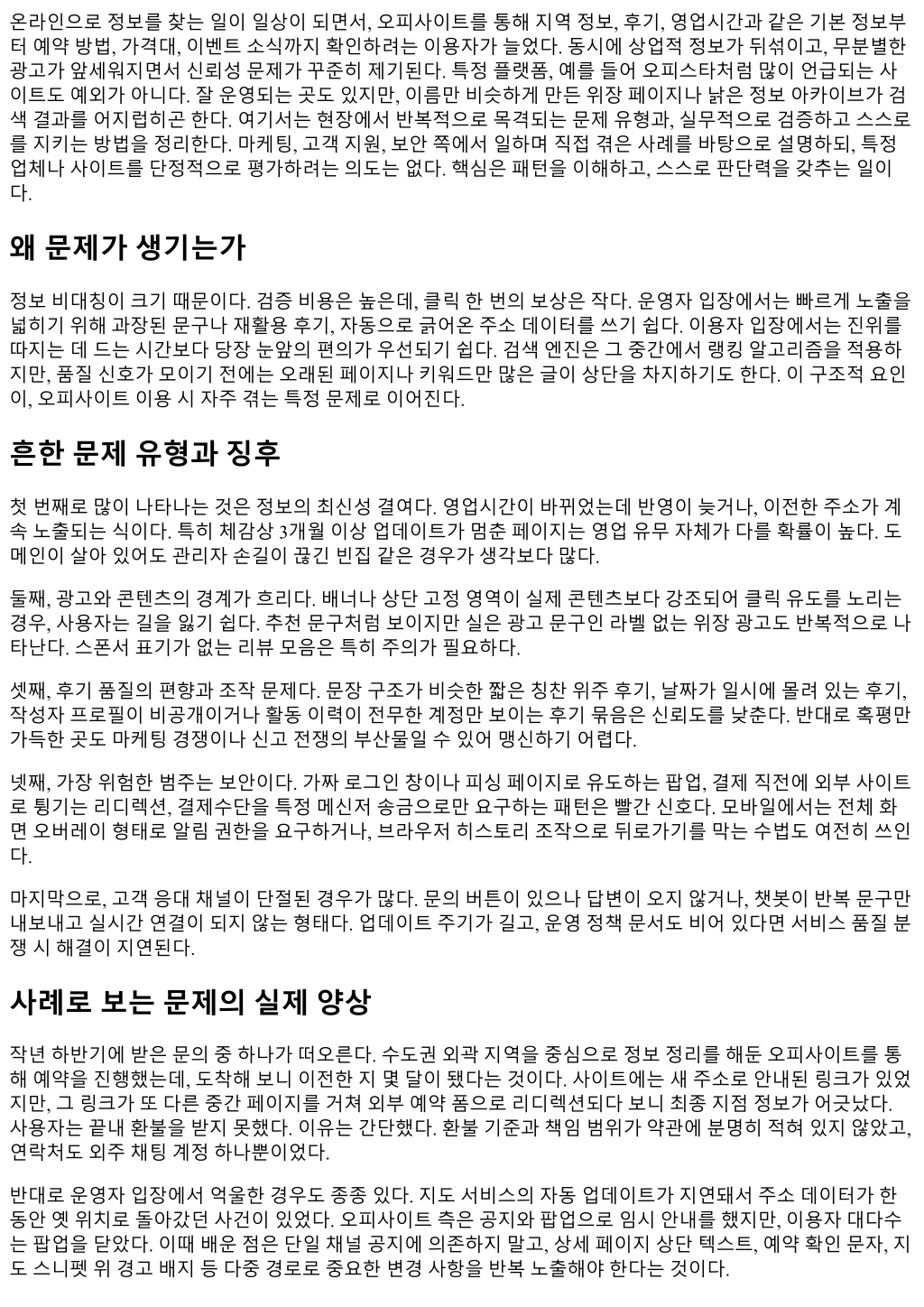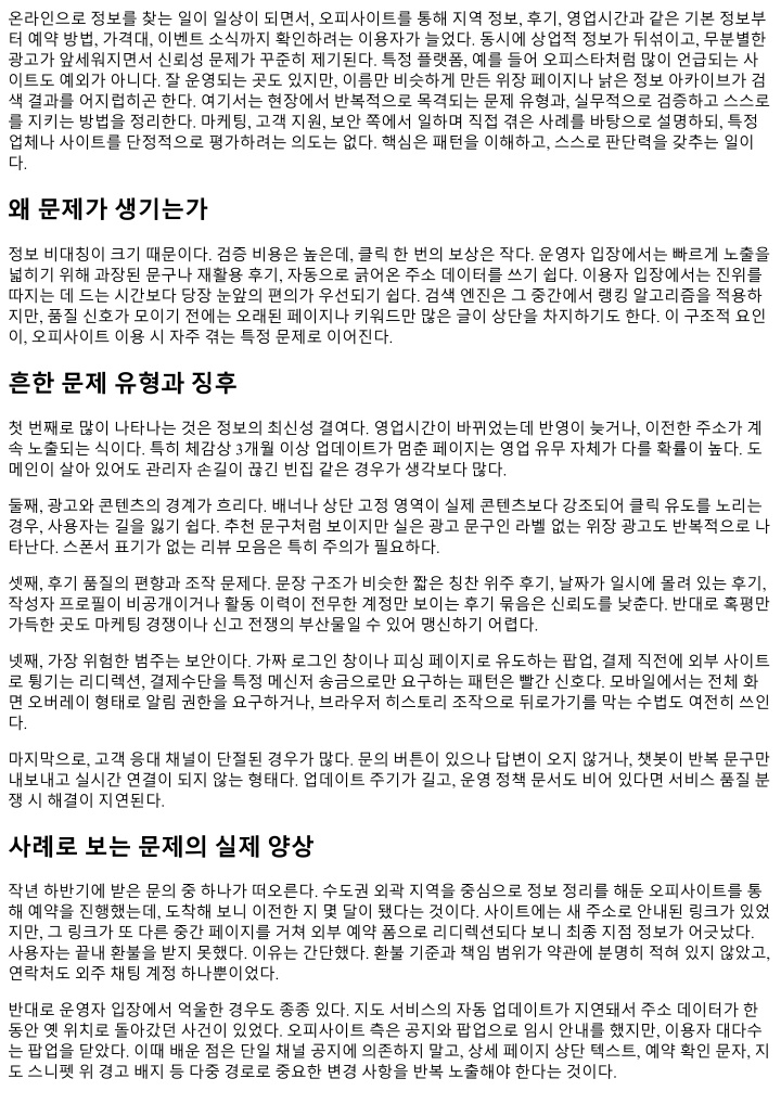 온라인으로정보를찾는일이일상이되면서, 오피사이트를통해지역정보, 후기, 영업시간과같은기본정보부 터예약방법, 가격대, 이벤트소식까지확인하려는이용자가늘었다. 동시에상업적정보가뒤섞이고, 무분별한 광고가앞세워지면서신뢰성문제가꾸준히제기된다. 특정플랫폼, 예를들어오피스타처럼많이언급되는사 이트도예외가아니다. 잘운영되는곳도있지만, 이름만비슷하게만든위장페이지나낡은정보아카이브가검 색결과를어지럽히곤한다. 여기서는현장에서반복적으로목격되는문제유형과, 실무적으로검증하고스스로 를지키는방법을정리한다. 마케팅, 고객지원, 보안쪽에서일하며직접겪은사례를바탕으로설명하되, 특정 업체나사이트를단정적으로평가하려는의도는없다. 핵심은패턴을이해하고, 스스로판단력을갖추는일이 다. 왜문제가생기는가 정보비대칭이크기때문이다. 검증비용은높은데, 클릭한번의보상은작다. 운영자입장에서는빠르게노출을 넓히기위해과장된문구나재활용후기, 자동으로긁어온주소데이터를쓰기쉽다. 이용자입장에서는진위를 따지는데드는시간보다당장눈앞의편의가우선되기쉽다. 검색엔진은그중간에서랭킹알고리즘을적용하 지만, 품질신호가모이기전에는오래된페이지나키워드만많은글이상단을차지하기도한다. 이구조적요인 이, 오피사이트이용시자주겪는특정문제로이어진다. 흔한문제유형과징후 첫번째로많이나타나는것은정보의최신성결여다. 영업시간이바뀌었는데반영이늦거나, 이전한주소가계 속노출되는식이다. 특히체감상 3개월이상업데이트가멈춘페이지는영업유무자체가다를확률이높다. 도 메인이살아있어도관리자손길이끊긴빈집같은경우가생각보다많다. 둘째, 광고와콘텐츠의경계가흐리다. 배너나상단고정영역이실제콘텐츠보다강조되어클릭유도를노리는 경우, 사용자는길을잃기쉽다. 추천문구처럼보이지만실은광고문구인라벨없는위장광고도반복적으로나 타난다. 스폰서표기가없는리뷰모음은특히주의가필요하다. 셋째, 후기품질의편향과조작문제다. 문장구조가비슷한짧은칭찬위주후기, 날짜가일시에몰려있는후기, 작성자프로필이비공개이거나활동이력이전무한계정만보이는후기묶음은신뢰도를낮춘다. 반대로혹평만 가득한곳도마케팅경쟁이나신고전쟁의부산물일수있어맹신하기어렵다. 넷째, 가장위험한범주는보안이다. 가짜로그인창이나피싱페이지로유도하는팝업, 결제직전에외부사이트 로튕기는리디렉션, 결제수단을특정메신저송금으로만요구하는패턴은빨간신호다. 모바일에서는전체화 면오버레이형태로알림권한을요구하거나, 브라우저히스토리조작으로뒤로가기를막는수법도여전히쓰인 다. 마지막으로, 고객응대채널이단절된경우가많다. 문의버튼이있으나답변이오지않거나, 챗봇이반복문구만 내보내고실시간연결이되지않는형태다. 업데이트주기가길고, 운영정책문서도비어있다면서비스품질분 쟁시해결이지연된다. 사례로보는문제의실제양상 작년하반기에받은문의중하나가떠오른다. 수도권외곽지역을중심으로정보정리를해둔오피사이트를통 해예약을진행했는데, 도착해보니이전한지몇달이됐다는것이다. 사이트에는새주소로안내된링크가있었 지만, 그링크가또다른중간페이지를거쳐외부예약폼으로리디렉션되다보니최종지점정보가어긋났다. 사용자는끝내환불을받지못했다. 이유는간단했다. 환불기준과책임범위가약관에분명히적혀있지않았고, 연락처도외주채팅계정하나뿐이었다. 반대로운영자입장에서억울한경우도종종있다. 지도서비스의자동업데이트가지연돼서주소데이터가한 동안옛위치로돌아갔던사건이있었다. 오피사이트측은공지와팝업으로임시안내를했지만, 이용자대다수 는팝업을닫았다. 이때배운점은단일채널공지에의존하지말고, 상세페이지상단텍스트, 예약확인문자, 지 도스니펫위경고배지등다중경로로중요한변경사항을반복노출해야한다는것이다.
