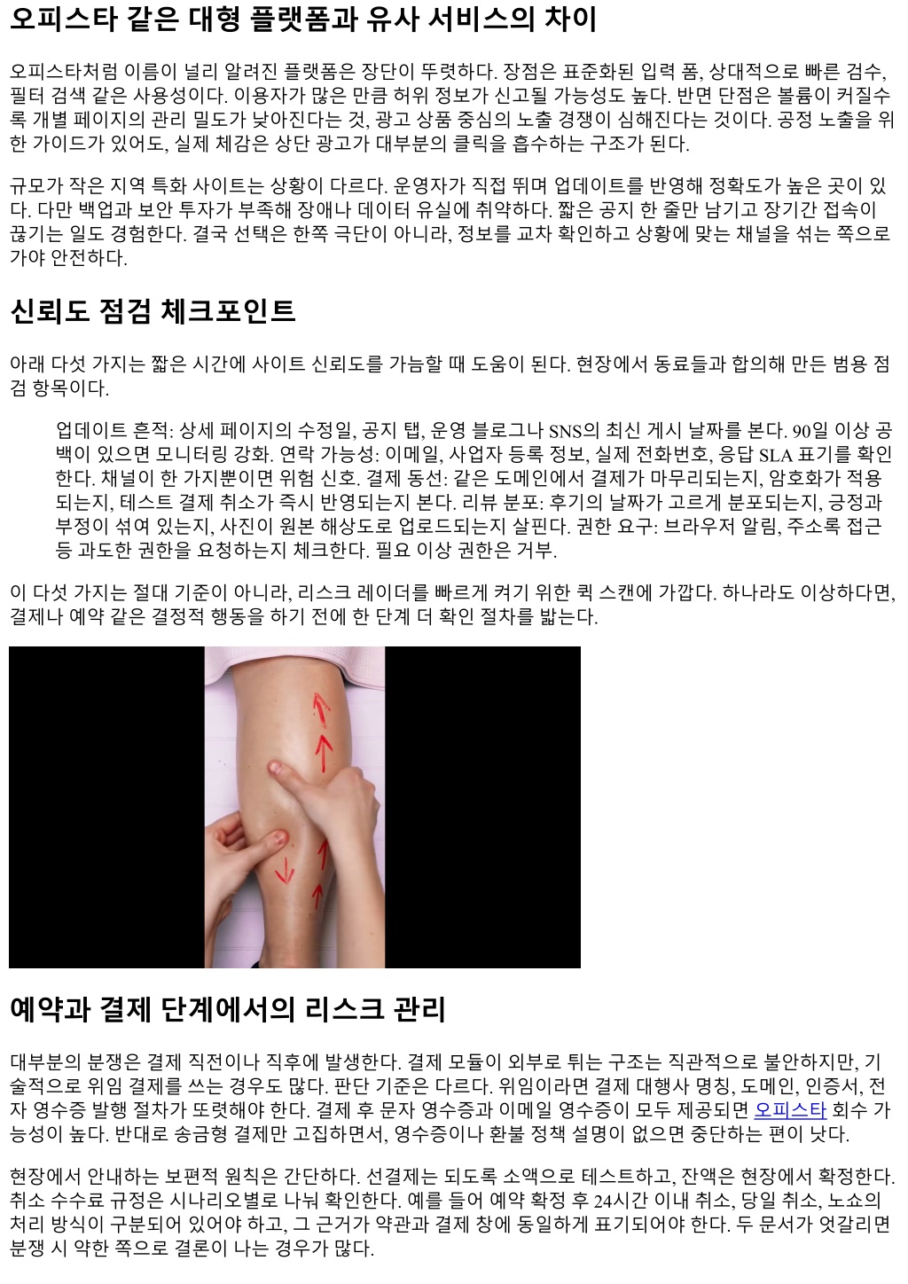 오피스타같은대형플랫폼과유사서비스의차이 오피스타처럼이름이널리알려진플랫폼은장단이뚜렷하다. 장점은표준화된입력폼, 상대적으로빠른검수, 필터검색같은사용성이다. 이용자가많은만큼허위정보가신고될가능성도높다. 반면단점은볼륨이커질수 록개별페이지의관리밀도가낮아진다는것, 광고상품중심의노출경쟁이심해진다는것이다. 공정노출을위 한가이드가있어도, 실제체감은상단광고가대부분의클릭을흡수하는구조가된다. 규모가작은지역특화사이트는상황이다르다. 운영자가직접뛰며업데이트를반영해정확도가높은곳이있 다. 다만백업과보안투자가부족해장애나데이터유실에취약하다. 짧은공지한줄만남기고장기간접속이 끊기는일도경험한다. 결국선택은한쪽극단이아니라, 정보를교차확인하고상황에맞는채널을섞는쪽으로 가야안전하다. 신뢰도점검체크포인트 아래다섯가지는짧은시간에사이트신뢰도를가늠할때도움이된다. 현장에서동료들과합의해만든범용점 검항목이다. 업데이트흔적: 상세페이지의수정일, 공지탭, 운영블로그나 SNS의최신게시날짜를본다. 90일이상공 백이있으면모니터링강화. 연락가능성: 이메일, 사업자등록정보, 실제전화번호, 응답 SLA 표기를확인 한다. 채널이한가지뿐이면위험신호. 결제동선: 같은도메인에서결제가마무리되는지, 암호화가적용 되는지, 테스트결제취소가즉시반영되는지본다. 리뷰분포: 후기의날짜가고르게분포되는지, 긍정과 부정이섞여있는지, 사진이원본해상도로업로드되는지살핀다. 권한요구: 브라우저알림, 주소록접근 등과도한권한을요청하는지체크한다. 필요이상권한은거부. 이다섯가지는절대기준이아니라, 리스크레이더를빠르게켜기위한퀵스캔에가깝다. 하나라도이상하다면, 결제나예약같은결정적행동을하기전에한단계더확인절차를밟는다. 예약과결제단계에서의리스크관리 대부분의분쟁은결제직전이나직후에발생한다. 결제모듈이외부로튀는구조는직관적으로불안하지만, 기 술적으로위임결제를쓰는경우도많다. 판단기준은다르다. 위임이라면결제대행사명칭, 도메인, 인증서, 전 자영수증발행절차가또렷해야한다. 결제후문자영수증과이메일영수증이모두제공되면오피스타회수가 능성이높다. 반대로송금형결제만고집하면서, 영수증이나환불정책설명이없으면중단하는편이낫다. 현장에서안내하는보편적원칙은간단하다. 선결제는되도록소액으로테스트하고, 잔액은현장에서확정한다. 취소수수료규정은시나리오별로나눠확인한다. 예를들어예약확정후 24시간이내취소, 당일취소, 노쇼의 처리방식이구분되어있어야하고, 그근거가약관과결제창에동일하게표기되어야한다. 두문서가엇갈리면 분쟁시약한쪽으로결론이나는경우가많다.