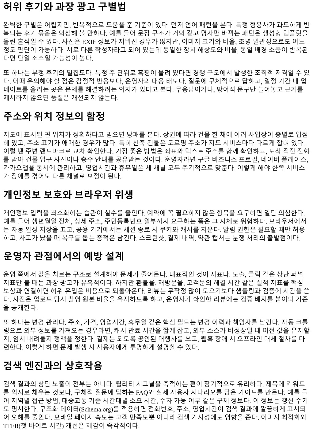 허위후기와과장광고구별법 완벽한구별은어렵지만, 반복적으로도움을준기준이있다. 먼저언어패턴을본다. 특정형용사가과도하게반 복되는후기묶음은의심해볼만하다. 예를들어문장구조가거의같고명사만바뀌는패턴은생성형템플릿을 돌린흔적일수있다. 사진은 EXIF 정보가지워진경우가많지만, 이미지크기와비율, 조명일관성으로도어느 정도판단이가능하다. 서로다른작성자라고되어있는데동일한장치해상도와비율, 동일배경소품이반복된 다면단일소스일가능성이높다. 또하나는부정후기의밀집도다. 특정주단위로혹평이몰려있다면경쟁구도에서발생한조직적저격일수있 다. 이때유의해야할점은감정적반응보다, 운영자의대응태도다. 질문에구체적으로답하고, 일정기간내업 데이트를올리는곳은문제를해결하려는의지가있다고본다. 무응답이거나, 방어적문구만늘어놓고근거를 제시하지않으면품질은개선되지않는다. 주소와위치정보의함정 지도에표시된핀위치가정확하다고믿으면낭패를본다. 상권에따라건물한채에여러사업장이층별로입점 해있고, 주소표기가애매한경우가많다. 특히신축건물은도로명주소가지도서비스마다다르게잡혀있다. 이럴땐주변랜드마크로교차확인한다. 가장좋은방법은좌표와텍스트주소를함께확인하고, 도착직전전화 를받아건물입구사진이나층수안내를공유받는것이다. 운영자라면구글비즈니스프로필, 네이버플레이스, 카카오맵을동시에관리하고, 영업시간과휴무일은세채널모두주기적으로맞춘다. 이렇게해야한쪽서비스 가장애를겪어도다른채널로보정이된다. 개인정보보호와브라우저위생 개인정보입력을최소화하는습관이실수를줄인다. 예약에꼭필요하지않은항목을요구하면일단의심한다. 예를들어생년월일전체, 상세주소, 주민등록번호일부까지요구하는폼은그자체로위험하다. 브라우저에서 는자동완성저장을끄고, 공용기기에서는세션종료시쿠키와캐시를지운다. 알림권한은필요할때만허용 하고, 사고가났을때복구를돕는증적은남긴다. 스크린샷, 결제내역, 약관캡처는분쟁처리의출발점이다. 운영자관점에서의예방설계 운영쪽에서값을치르는구조로설계해야문제가줄어든다. 대표적인것이지표다. 노출, 클릭같은상단퍼널 지표만볼때는과장광고가유혹적이다. 하지만환불율, 재방문율, 고객문의해결시간같은질적지표를핵심 보상과연결하면허위유입은비용으로되돌아온다. 리뷰는무작정많이모으기보다샘플링과검증에시간을쓴 다. 사진은업로드당시촬영원본비율을유지하도록하고, 운영자가확인한리뷰에는검증배지를붙이되기준 을공개한다. 또하나는변경관리다. 주소, 가격, 영업시간, 휴무일같은핵심필드는변경이력과책임자를남긴다. 자동크롤 링으로외부정보를가져오는경우라면, 캐시만료시간을짧게잡고, 외부소스가비정상일때이전값을유지할 지, 임시내려둘지정책을정한다. 결제는되도록공인된대행사를쓰고, 웹훅장애시오프라인대체절차를마 련한다. 이렇게하면문제발생시사용자에게투명하게설명할수있다. 검색엔진과의상호작용 검색결과의상단노출이전부는아니다. 퀄리티시그널을축적하는편이장기적으로유리하다. 제목에키워드 를억지로채우는것보다, 구체적질문에답하는 FAQ와실제사용자시나리오를담은가이드를만든다. 예를들 어지역별접근방법, 대중교통기준시간대별소요시간, 주차가능여부같은구체정보다. 이정보는갱신주기 도명시한다. 구조화데이터(Schema.org)를적용하면전화번호, 주소, 영업시간이검색결과에깔끔하게표시되 어오해를줄인다. 모바일페이지속도는고객만족도뿐아니라검색가시성에도영향을준다. 이미지최적화와 TTFB(첫바이트시간) 개선은체감이즉각적이다.