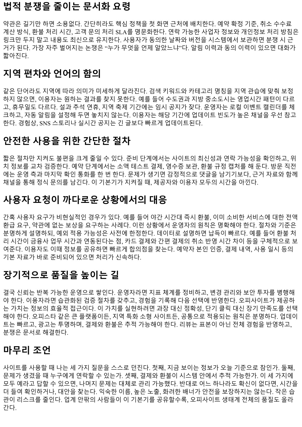 법적분쟁을줄이는문서화요령 약관은길기만하면소용없다. 간단히라도핵심정책을첫화면근처에배치한다. 예약확정기준, 취소수수료 계산방식, 환불처리시간, 고객문의처리 SLA를명문화한다. 연락가능한사업자정보와개인정보처리방침은 링크만두지말고내용도최신으로유지한다. 사용자가동의한날짜와버전을시스템에서보관하면분쟁시근 거가된다. 가장자주벌어지는논쟁은 “누가무엇을언제알았느냐”다. 알림이력과동의이력이있으면대화가 짧아진다. 지역편차와언어의함의 같은단어라도지역에따라의미가미세하게달라진다. 검색키워드와카테고리명칭을지역관습에맞춰보정 하지않으면, 이용자는원하는결과를찾지못한다. 예를들어수도권과지방중소도시는영업시간패턴이다르 고, 휴무일도다르다. 설과추석연휴, 지역축제기간에는임시공지가잦다. 운영자는로컬이벤트캘린더를체 크하고, 자동알림을설정해두면놓치지않는다. 이용자는해당기간에업데이트빈도가높은채널을우선참고 한다. 경험상, SNS 스토리나실시간공지는긴글보다빠르게업데이트된다. 안전한사용을위한간단한절차 짧은절차만지켜도불편을크게줄일수있다. 준비단계에서는사이트의최신성과연락가능성을확인하고, 위 치정보를교차검증한다. 예약단계에서는소액테스트결제, 영수증보관, 환불규정캡처를해둔다. 방문직전 에는운영측과마지막확인통화를한번한다. 문제가생기면감정적으로댓글을남기기보다, 근거자료와함께 채널을통해정식문의를남긴다. 이기본기가지켜질때, 제공자와이용자모두의시간을아낀다. 사용자요청이까다로운상황에서의대응 간혹사용자요구가비현실적인경우가있다. 예를들어야간시간대즉시환불, 이미소비한서비스에대한전액 환급요구, 약관에없는보상을요구하는사례다. 이런상황에서운영자의원칙은명확해야한다. 절차와기준은 분명하게설명하되, 예외적용가능성은사전에한정한다. 데이터로설명하면납득이빠르다. 예를들어환불처 리시간이금융사업무시간과연동된다는점, 카드결제와간편결제의취소반영시간차이등을구체적으로보 여준다. 이용자도이때정보를공유하면빠르게합의점을찾는다. 예약자본인인증, 결제내역, 사용일시등의 기본자료가바로준비되어있으면처리가신속하다. 장기적으로품질을높이는길 결국신뢰는반복가능한운영으로쌓인다. 운영자라면지표체계를정비하고, 변경관리와보안투자를병행해 야한다. 이용자라면습관화된검증절차를갖추고, 경험을기록해다음선택에반영한다. 오피사이트가제공하 는가치는정보의효율적접근이다. 이가치를실현하려면과장대신정확성, 단기클릭대신장기만족도를선택 해야한다. 오피스타같은큰플랫폼이든, 지역특화소형사이트든, 공통으로적용되는원칙은분명하다. 업데이 트는빠르고, 광고는투명하며, 결제와환불은추적가능해야한다. 리뷰는표본이아닌전체경험을반영하고, 분쟁은문서로해결한다. 마무리조언 사이트를사용할때나는세가지질문을스스로던진다. 첫째, 지금보이는정보가오늘기준으로참인가. 둘째, 문제가생겼을때누구에게연락할수있는가. 셋째, 결제와환불이시스템안에서추적가능한가. 이세가지에 모두예라고답할수있으면, 나머지문제는대체로관리가능했다. 반대로어느하나라도확신이없다면, 시간을 더들여확인하거나, 대안을찾는다. 익숙한이름, 높은노출, 화려한배너가안전을보장하지는않는다. 작은습 관이리스크를줄인다. 업계안팎의사람들이이기본기를공유할수록, 오피사이트생태계전체의품질도올라 간다.