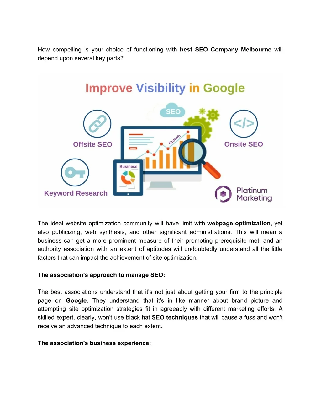 Platinum SEO provides best SEO Company Melbourne that helps achieving the targeted SEO results through all the right ways. There are incredibly only a few of issues to pay keen attention so that a business can reach the desired Google position using site optimization techniques. https://www.platinumseo.com.au/