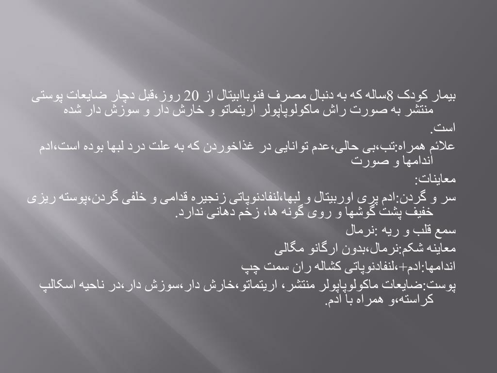 بیمار کودک 8ساله که به دنبال مصرف فنوباابیتال از 20 روز،قبل دچار ضایعات پوستی منتشر به صورت راش ماکولوپاپولر اریتماتو و خارش دار و سوزش دار شده است. علائم همراه:تب،بی حالی،عدم توانایی در غذاخوردن که به علت درد لبها بوده است،ادم اندامها و صورت معاینات: سر و گردن:ادم پری اوربیتال و لبها،لنفادنوپاتی زنجیره قدامی و خلفی گردن،پوسته ریزی خفیف پشت گوشها و روی گونه ها، زخم دهانی ندارد. سمع قلب و ریه :نرمال معاینه شکم:نرمال،بدون ارگانو مگالی اندامها:ادم+،لنفادنوپاتی کشاله ران سمت چپ پوست:ضایعات ماکولوپاپولر منتشر، اریتماتو،خارش دار،سوزش دار،در ناحیه اسکالپ کراسته،و همراه با ادم.