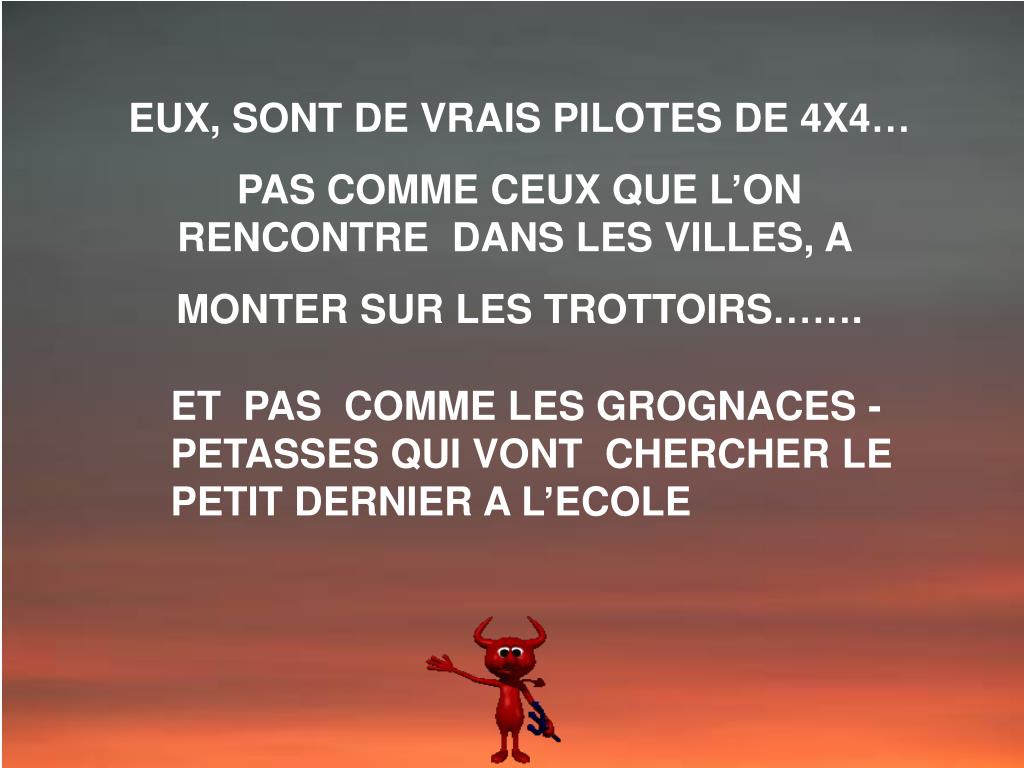 4 X 4 ?. SAIS-TU CE QU’EST UN VRAI 4X4 ?. LO. EUX, SONT DE VRAIS PILOTES DE 4X4… PAS COMME CEUX QUE L’ON RENCONTRE DANS LES VILLES, A MONTER SUR LES TROTTOIRS……. ET PAS COMME LES GROGNACES -PETASSES QUI VONT CHERCHER LE PETIT DERNIER A L’ECOLE.