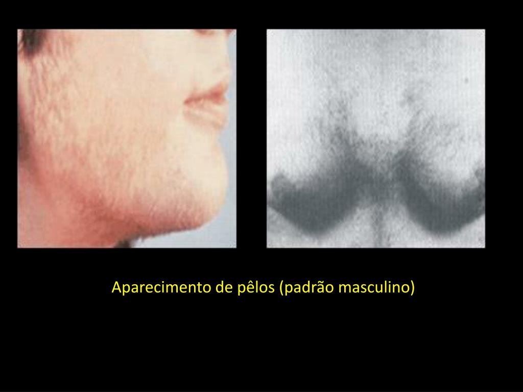 Emmulheres, além dos acima citados podem ocorrer: • Virilização; • Crescimento de pelos na face e no corpo; • Engrossamento da voz; • Hipertrofia do clitóris; • Redução dos seios; • Distúrbios menstruais e ovulatórios.