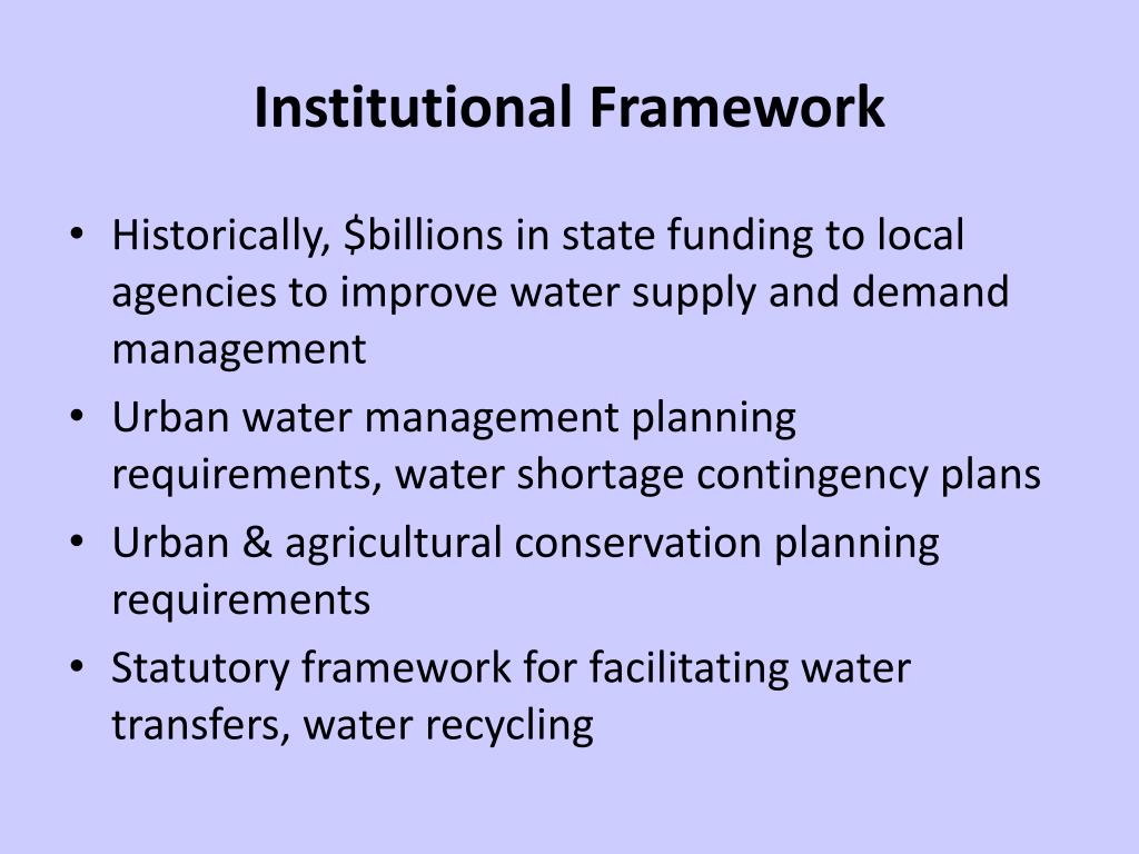Institutional Framework • Historically, $billions in state funding to local agencies to improve water supply and demand management • Urban water management planning requirements, water shortage contingency plans • Urban & agricultural conservation planning requirements • Statutory framework for facilitating water transfers, water recycling