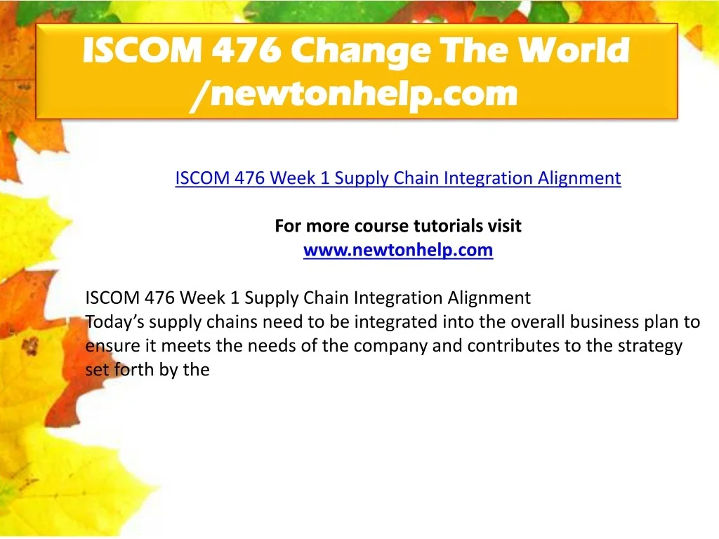 ISCOM 476 Change The World /newtonhelp.com ISCOM 476 Week 1 Supply Chain Integration Alignment For more course tutorials visit www.newtonhelp.com ISCOM 476 Week 1 Supply Chain Integration Alignment Today’s supply chains need to be integrated into the overall business plan to ensure it meets the needs of the company and contributes to the strategy set forth by the