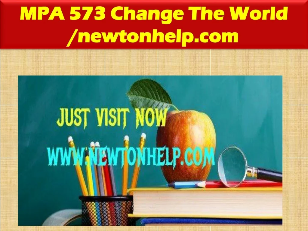 MPA 573 Change The World /newtonhelp.com MPA 573 Week 2 Policy Presentation (Forecasting) For more course tutorials visit www.newtonhelp.com MPA 573 Week 2 Policy Presentation Choose and complete one of the two assignment options: Option 1: Forecasting Comparison Presentation Identify a state, local or federal policy that impacts your organization or community.
