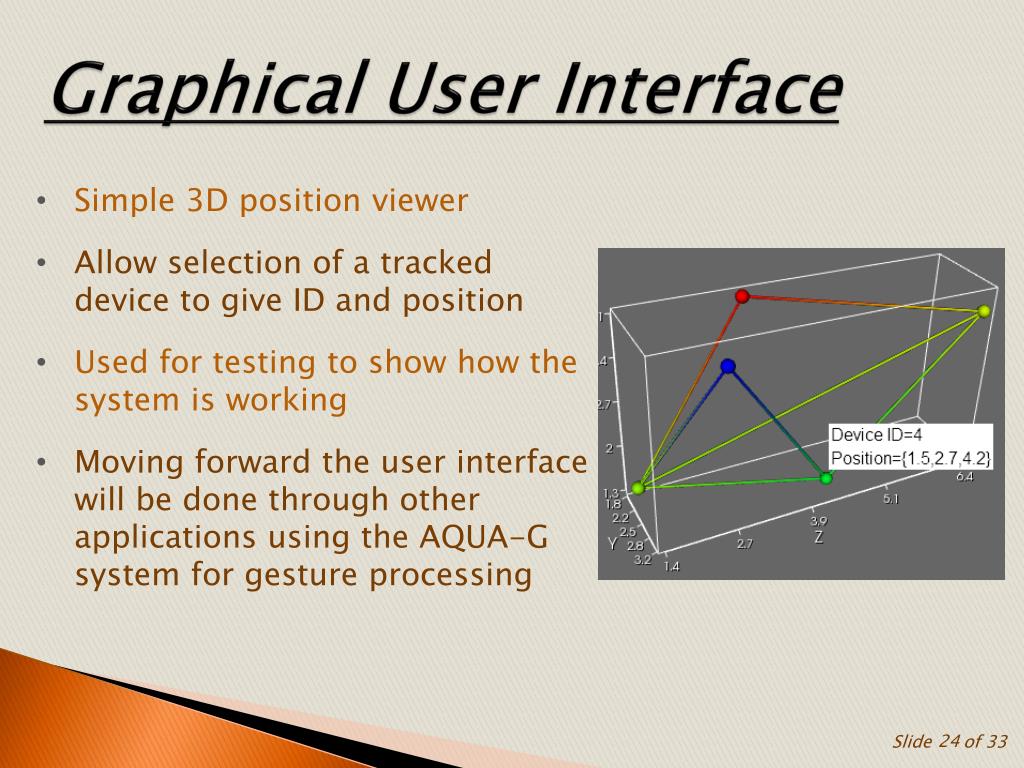 Graphical User Interface • Simple 3D position viewer • Allow selection of a tracked device to give ID and position • Used for testing to show how the system is working • Moving forward the user interface will be done through other applications using the AQUA-G system for gesture processing Slide of 33