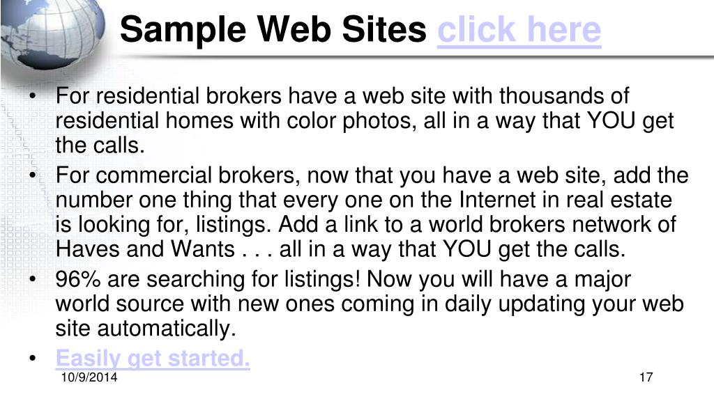 Sample Web Sites click here • For residential brokers have a web site with thousands of residential homes with color photos, all in a way that YOU get the calls. • For commercial brokers, now that you have a web site, add the number one thing that every one on the Internet in real estate is looking for, listings. Add a link to a world brokers network of Haves and Wants . . . all in a way that YOU get the calls. • 96% are searching for listings! Now you will have a major world source with new ones coming in daily updating your web site automatically. • Easily get started.