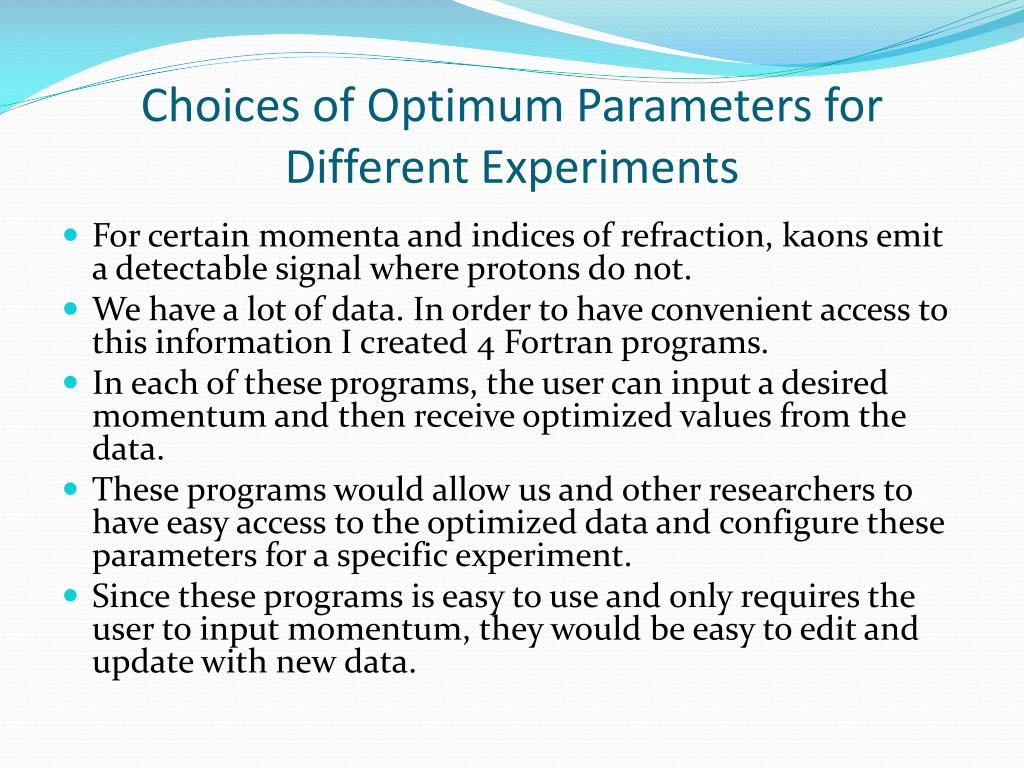 Choices of Optimum Parameters for Different Experiments • For certain momenta and indices of refraction, kaons emit a detectable signal where protons do not. • We have a lot of data. In order to have convenient access to this information I created 4 Fortran programs. • In each of these programs, the user can input a desired momentum and then receive optimized values from the data. • These programs would allow us and other researchers to have easy access to the optimized data and configure these parameters for a specific experiment. • Since these programs is easy to use and only requires the user to input momentum, they would be easy to edit and update with new data.