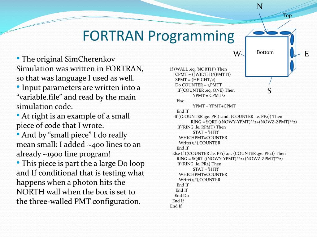 N Top FORTRAN Programming W Bottom E • The original SimCherenkov Simulation was written in FORTRAN, so that was language I used as well. • Input parameters are written into a “variable.file” and read by the main simulation code. • At right is an example of a small piece of code that I wrote. • And by “small piece” I do really mean small: I added ~400 lines to an already ~1900 line program! • This piece is part the a large Do loop and If conditional that is testing what happens when a photon hits the NORTH wall when the box is set to the three-walled PMT configuration. If (WALL .eq. 'NORTH') Then CPMT = ((WIDTH)/(PMTT)) ZPMT = (HEIGHT/2) Do COUNTER = 1,PMTT If (COUNTER .eq. ONE) Then YPMT = CPMT/2 Else YPMT = YPMT+CPMT End If If ((COUNTER .ge. PF1) .and. (COUNTER .le. PF2)) Then RING = SQRT ((NOWY-YPMT)**2+(NOWZ-ZPMT)**2) If (RING .le. RPMT) Then STAT = 'HIT!' WHICHPMT=COUNTER Write(5,*),COUNTER End If Else If ((COUNTER .le. PF1) .or. (COUNTER .ge. PF2)) Then RING = SQRT ((NOWY-YPMT)**2+(NOWZ-ZPMT)**2) If (RING .le. PR2) Then STAT = 'HIT!' WHICHPMT=COUNTER Write(5,*),COUNTER End If End If End Do End If End If S