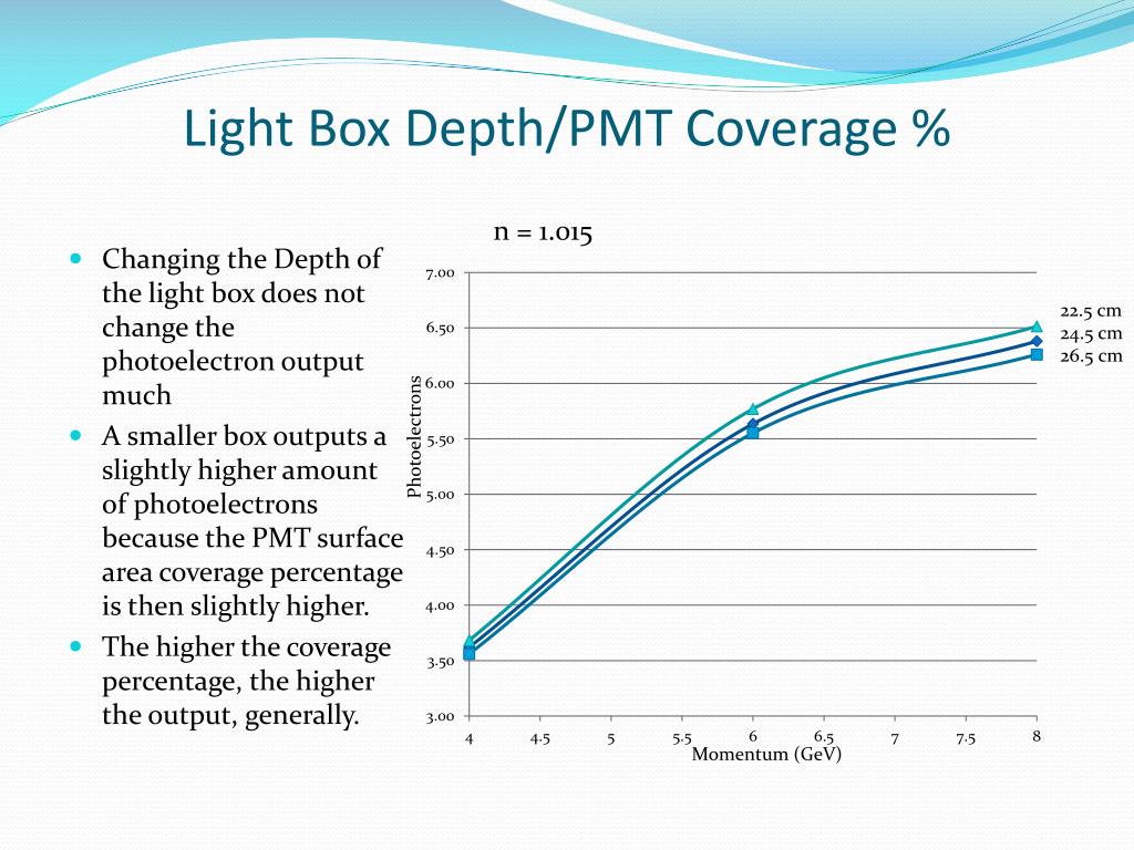 Light Box Depth/PMT Coverage % n = 1.015 • Changing the Depth of the light box does not change the photoelectron output much • A smaller box outputs a slightly higher amount of photoelectrons because the PMT surface area coverage percentage is then slightly higher. • The higher the coverage percentage, the higher the output, generally. 22.5 cm 24.5 cm 26.5 cm Photoelectrons Momentum (GeV)