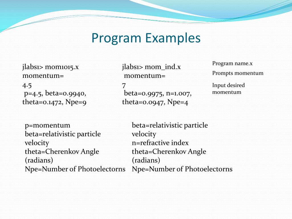 Program Examples Program name.x jlabs1> mom1015.x momentum= 4.5 p=4.5, beta=0.9940, theta=0.1472, Npe=9 jlabs1> mom_ind.x momentum= 7 beta=0.9975, n=1.007, theta=0.0947, Npe=4 Prompts momentum Input desired momentum p=momentum beta=relativistic particle velocity theta=Cherenkov Angle (radians) Npe=Number of Photoelectorns beta=relativistic particle velocity n=refractive index theta=Cherenkov Angle (radians) Npe=Number of Photoelectorns