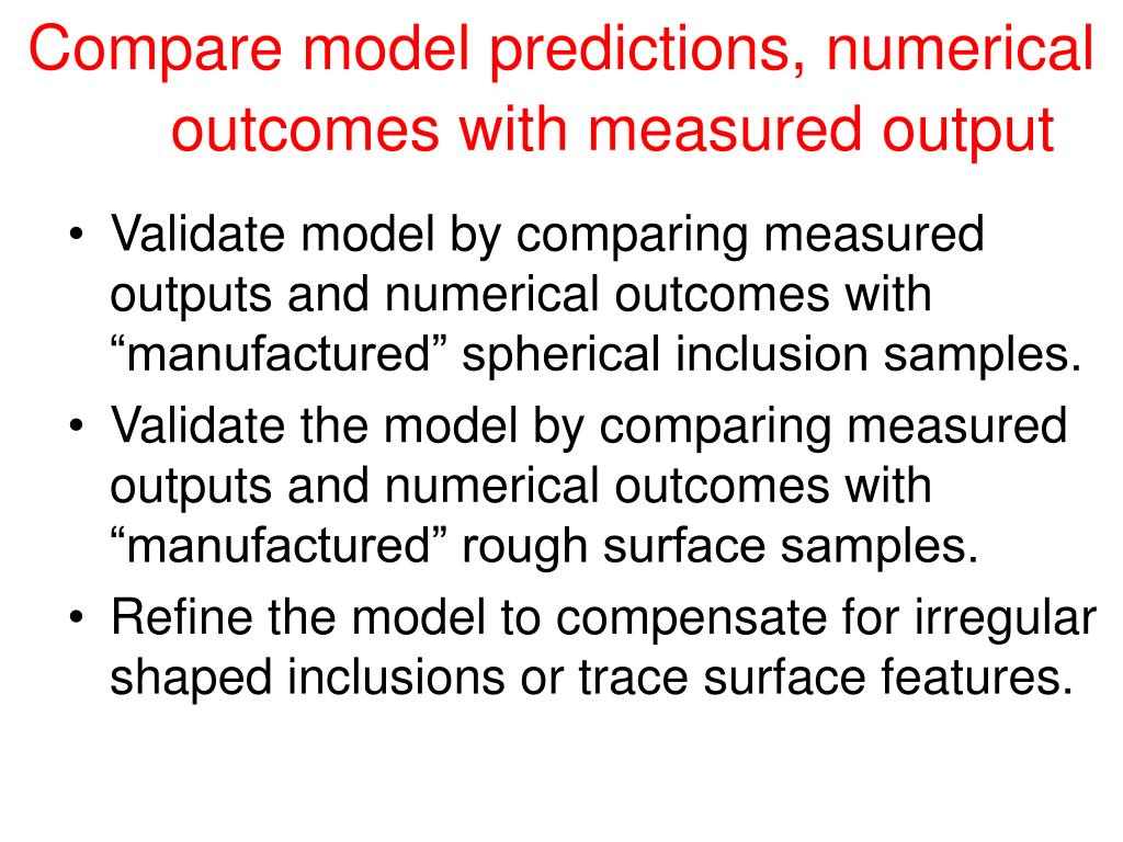 Compare model predictions, numerical outcomes with measured output • Validate model by comparing measured outputs and numerical outcomes with “manufactured” spherical inclusion samples. • Validate the model by comparing measured outputs and numerical outcomes with “manufactured” rough surface samples. • Refine the model to compensate for irregular shaped inclusions or trace surface features.