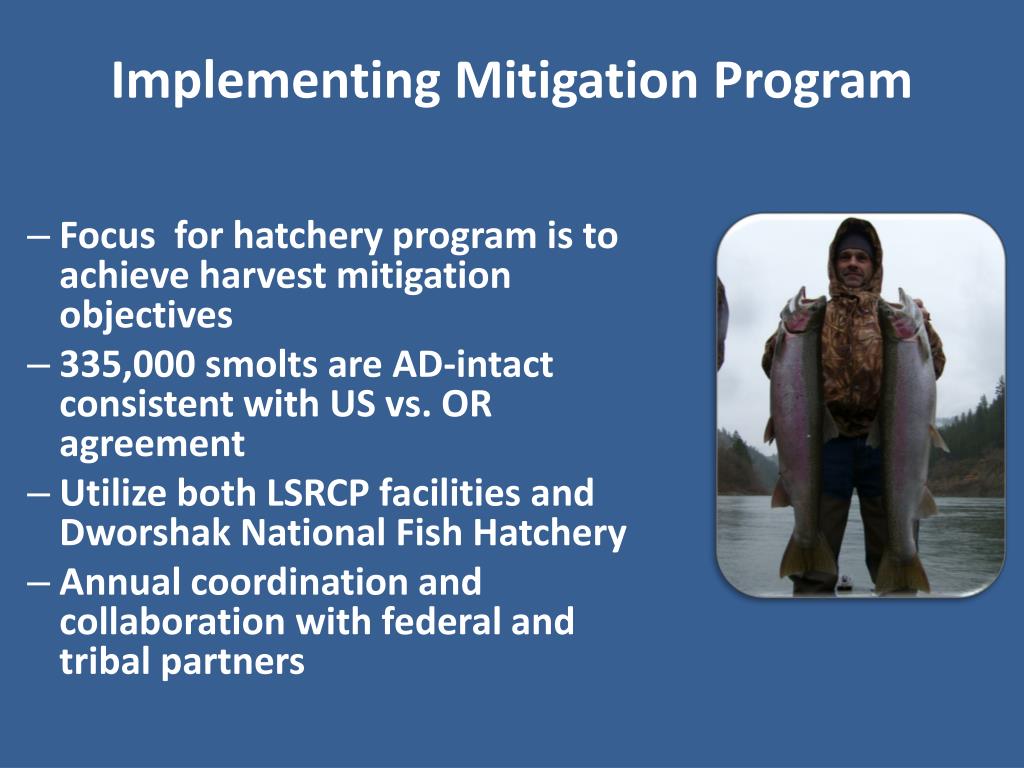 Implementing Mitigation Program • Focus for hatchery program is to achieve harvest mitigation objectives • 335,000 smolts are AD-intact consistent with US vs. OR agreement • Utilize both LSRCP facilities and Dworshak National Fish Hatchery • Annual coordination and collaboration with federal and tribal partners