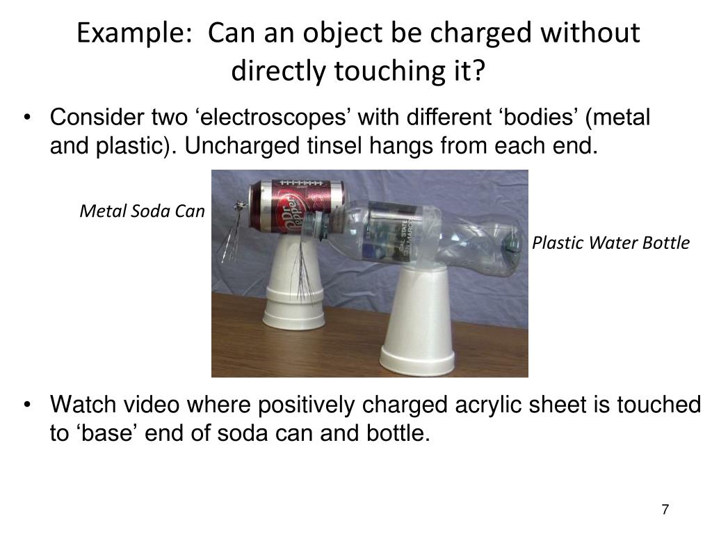Example: Can an object be charged without directly touching it? • Consider two ‘electroscopes’ with different ‘bodies’ (metal and plastic). Uncharged tinsel hangs from each end. Metal Soda Can Plastic Water Bottle • Watch video where positively charged acrylic sheet is touched to ‘base’ end of soda can and bottle.