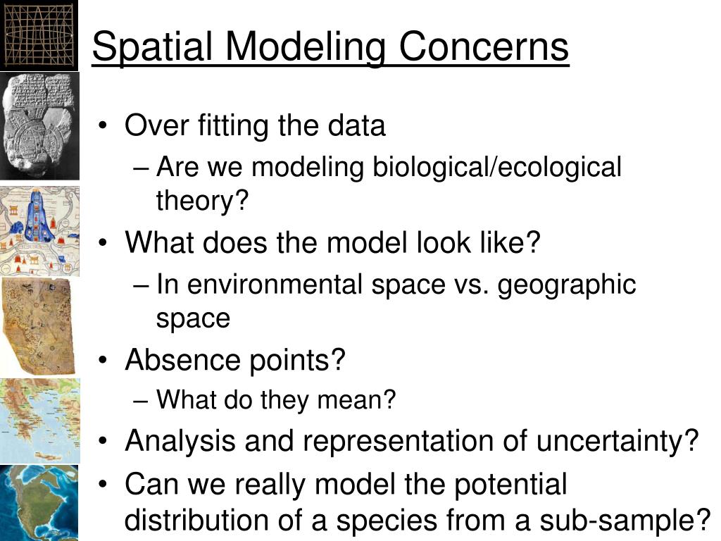 Spatial Modeling Concerns • Over fitting the data • Are we modeling biological/ecological theory? • What does the model look like? • In environmental space vs. geographic space • Absence points? • What do they mean? • Analysis and representation of uncertainty? • Can we really model the potential distribution of a species from a sub-sample?