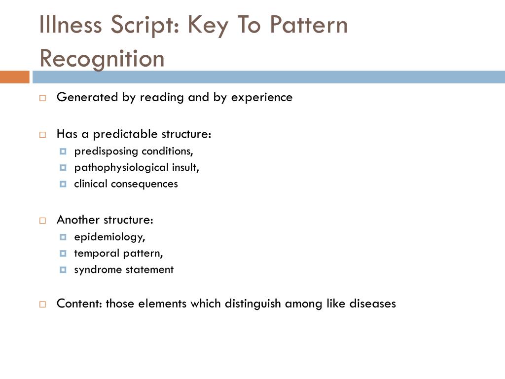 Illness Script: Key To Pattern Recognition • Generated by reading and by experience • Has a predictable structure: • predisposing conditions, • pathophysiological insult, • clinical consequences • Another structure: • epidemiology, • temporal pattern, • syndrome statement • Content: those elements which distinguish among like diseases