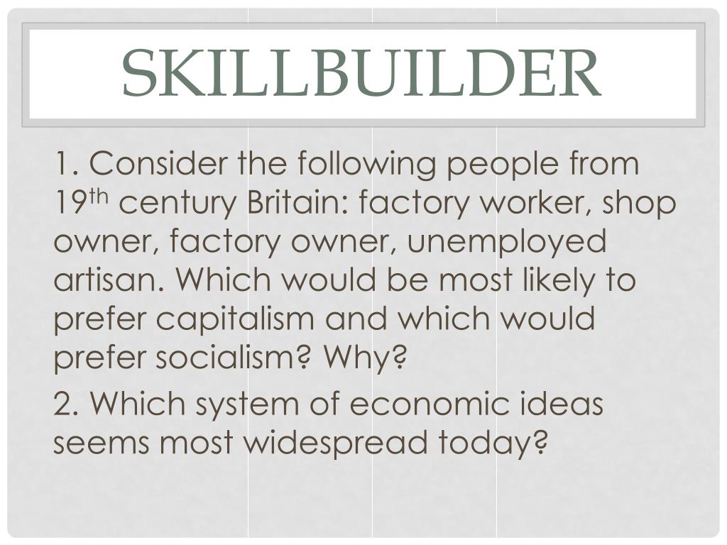 Skillbuilder 1. Consider the following people from 19th century Britain: factory worker, shop owner, factory owner, unemployed artisan. Which would be most likely to prefer capitalism and which would prefer socialism? Why? 2. Which system of economic ideas seems most widespread today?