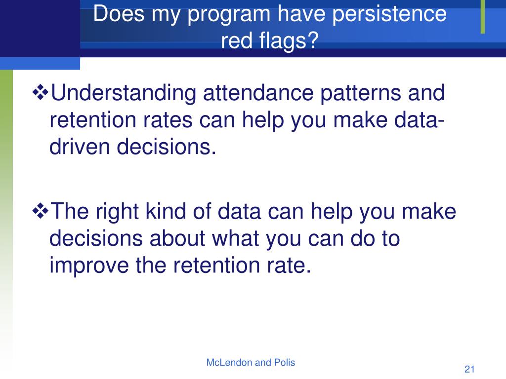 Does my program have persistence red flags? • Understanding attendance patterns and retention rates can help you make data-driven decisions. • The right kind of data can help you make decisions about what you can do to improve the retention rate. McLendon and Polis