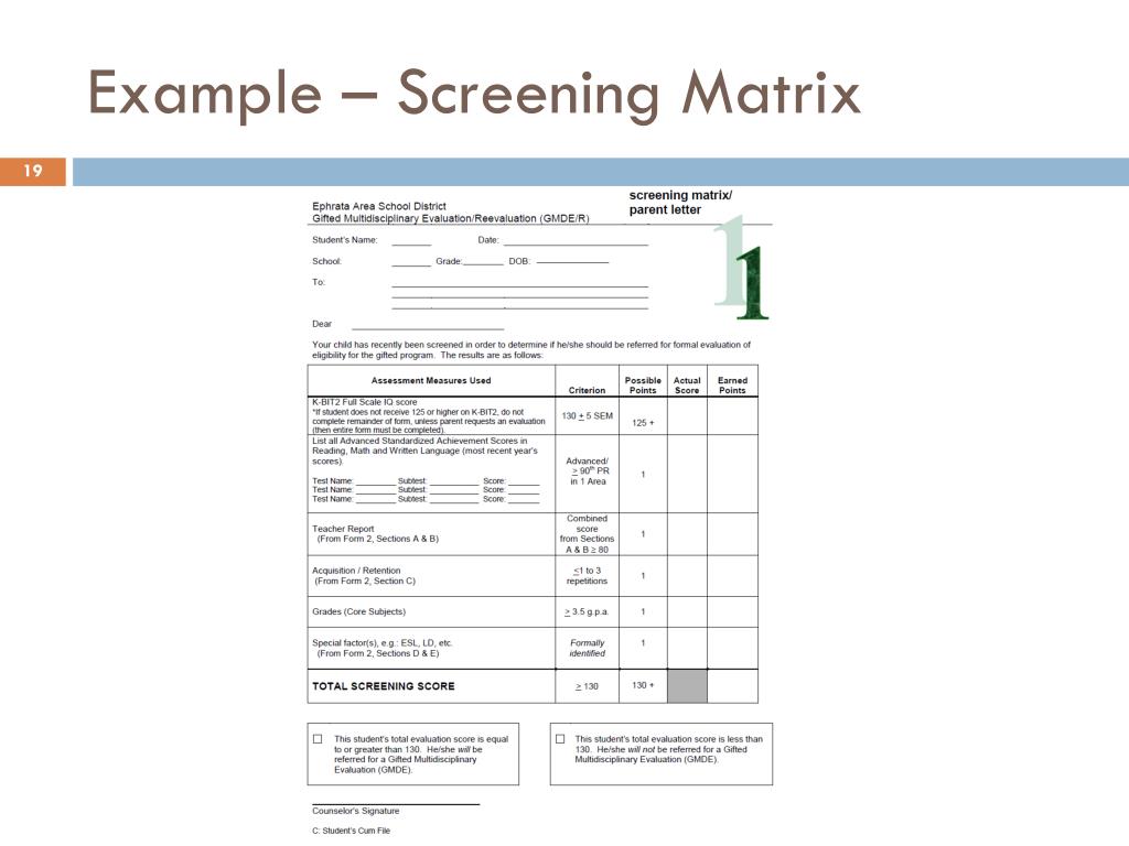 Traditional Screening Measures • Top 3-5% of students are selected as gifted • Committee reviews data from many sources (e.g., ability and achievement scores, nominations) for candidates • Use of point systems and cutoffs – Example matrix (next slide) • Identification process ends at beginning of school year