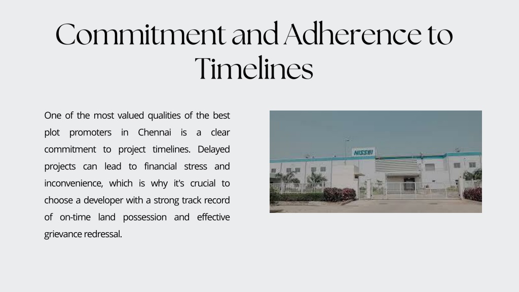 Commitment and Adherence to Timelines One of the most valued qualities of the best plot promoters in Chennai is a clear commitment to project timelines. Delayed projects can lead to financial stress and inconvenience, which is why it's crucial to choose a developer with a strong track record of on-time land possession and effective grievance redressal.