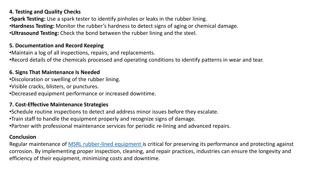 4. Testing and Quality Checks • Spark Testing: Use a spark tester to identify pinholes or leaks in the rubber lining. • Hardness Testing: Monitor the rubber’s hardness to detect signs of aging or chemical damage. • Ultrasound Testing: Check the bond between the rubber lining and the steel. • 5. Documentation and Record Keeping • Maintain a log of all inspections, repairs, and replacements. • Record details of the chemicals processed and operating conditions to identify patterns in wear and tear. • 6. Signs That Maintenance Is Needed • Discoloration or swelling of the rubber lining. • Visible cracks, blisters, or punctures. • Decreased equipment performance or increased downtime. • 7. Cost-Effective Maintenance Strategies • Schedule routine inspections to detect and address minor issues before they escalate. • Train staff to handle the equipment properly and recognize signs of damage. • Partner with professional maintenance services for periodic re-lining and advanced repairs. Conclusion Regular maintenance of MSRL rubber-lined equipment is critical for preserving its performance and protecting against corrosion. By implementing proper inspection, cleaning, and repair practices, industries can ensure the longevity and efficiency of their equipment, minimizing costs and downtime.