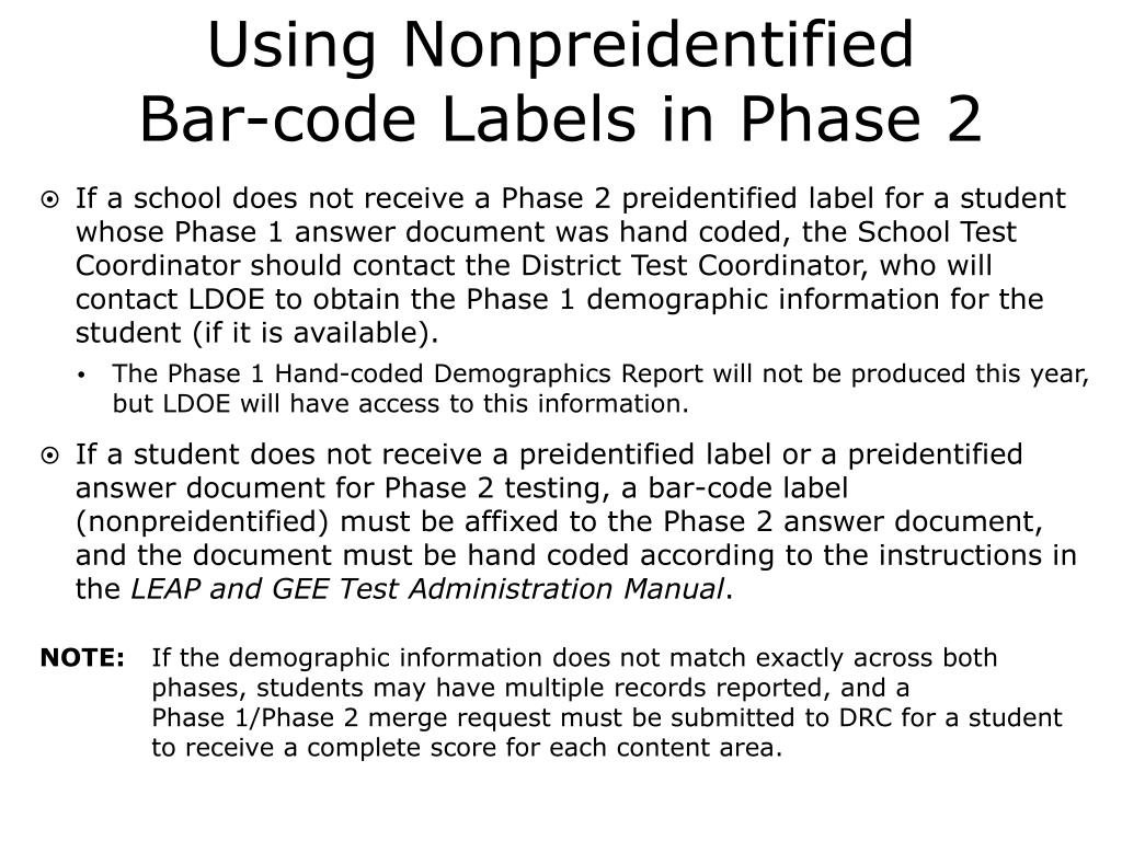 Using NonpreidentifiedBar-code Labels in Phase 2 • If a school does not receive a Phase 2 preidentified label for a student whose Phase 1 answer document was hand coded, the School Test Coordinator should contact the District Test Coordinator, who will contact LDOE to obtain the Phase 1 demographic information for the student (if it is available). • The Phase 1 Hand-coded Demographics Report will not be produced this year, but LDOE will have access to this information. • If a student does not receive a preidentified label or a preidentified answer document for Phase 2 testing, a bar-code label (nonpreidentified) must be affixed to the Phase 2 answer document, and the document must be hand coded according to the instructions in the LEAP and GEE Test Administration Manual. NOTE:If the demographic information does not match exactly across both phases, students may have multiple records reported, and a Phase 1/Phase 2 merge request must be submitted to DRC for a student to receive a complete score for each content area.