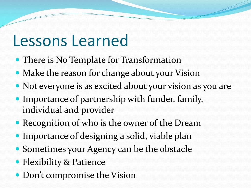 Lessons Learned • There is No Template for Transformation • Make the reason for change about your Vision • Not everyone is as excited about your vision as you are • Importance of partnership with funder, family, individual and provider • Recognition of who is the owner of the Dream • Importance of designing a solid, viable plan • Sometimes your Agency can be the obstacle • Flexibility & Patience • Don’t compromise the Vision