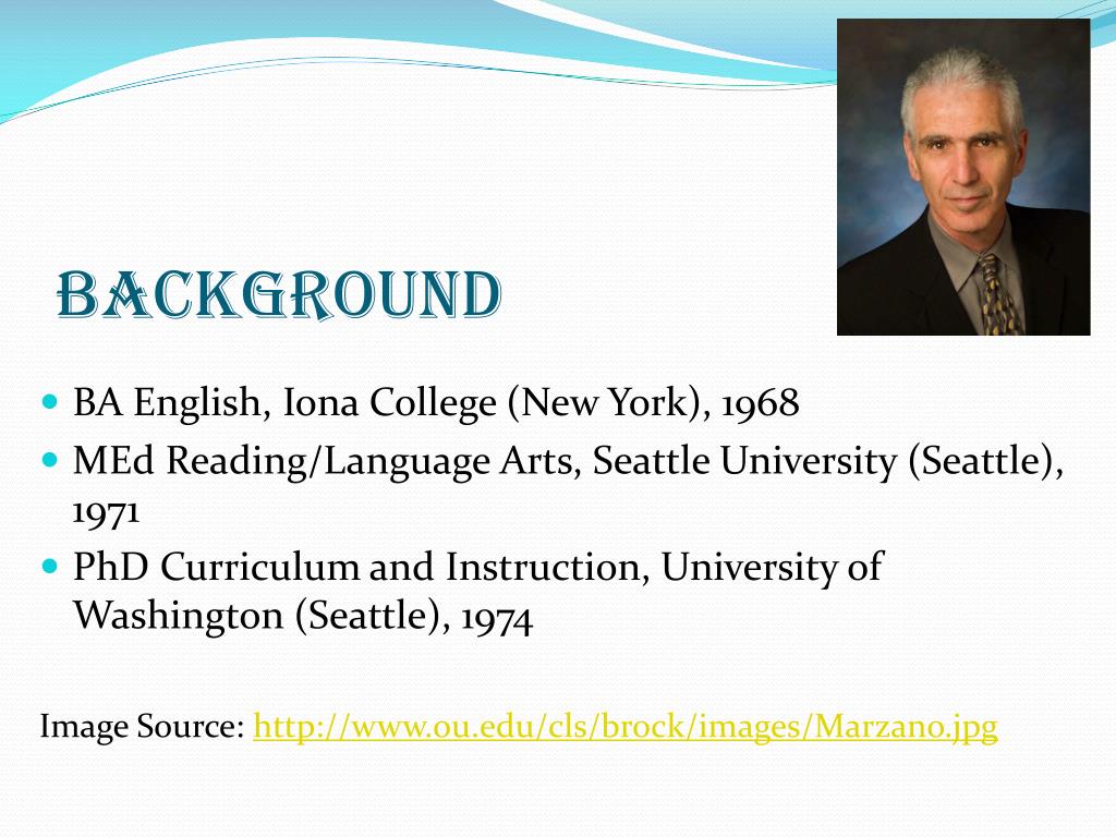 Background • BA English, Iona College (New York), 1968 • MEd Reading/Language Arts, Seattle University (Seattle), 1971 • PhD Curriculum and Instruction, University of Washington (Seattle), 1974 Image Source: http://www.ou.edu/cls/brock/images/Marzano.jpg