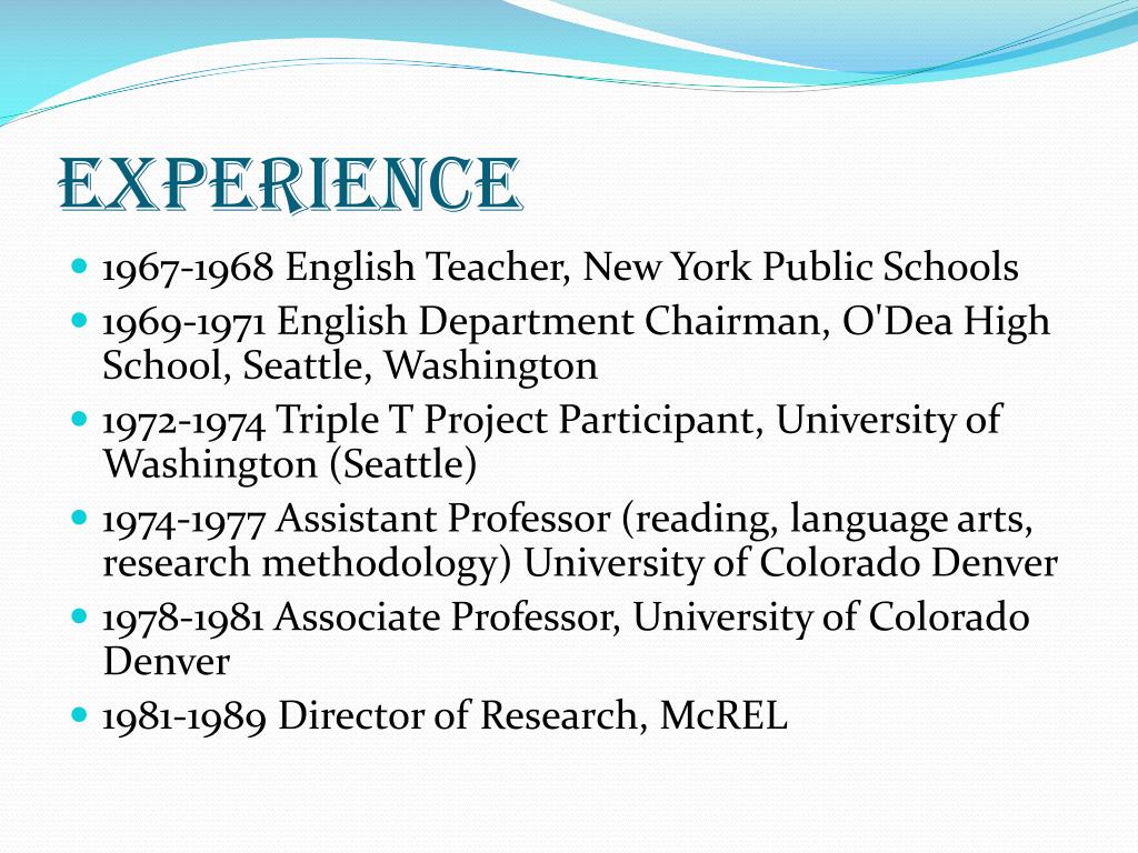 Experience • 1967-1968 English Teacher, New York Public Schools • 1969-1971 English Department Chairman, O'Dea High School, Seattle, Washington • 1972-1974 Triple T Project Participant, University of Washington (Seattle) • 1974-1977 Assistant Professor (reading, language arts, research methodology) University of Colorado Denver • 1978-1981 Associate Professor, University of Colorado Denver • 1981-1989 Director of Research, McREL