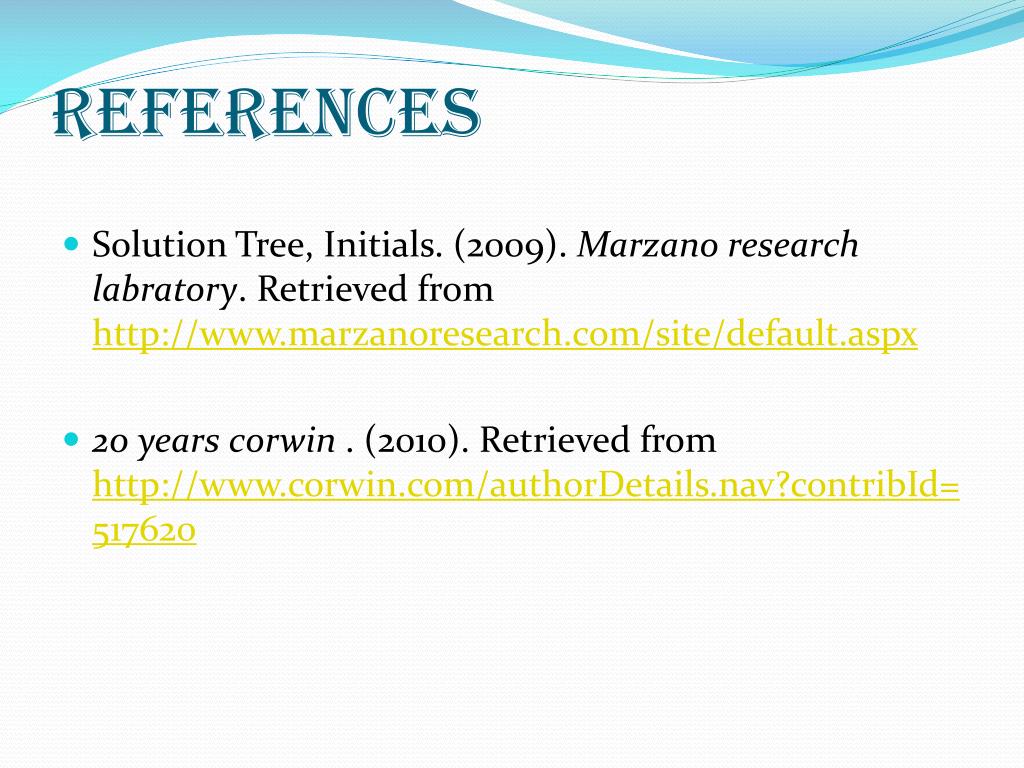 References • Solution Tree, Initials. (2009). Marzano research labratory. Retrieved from http://www.marzanoresearch.com/site/default.aspx • 20 years corwin. (2010). Retrieved from http://www.corwin.com/authorDetails.nav?contribId=517620