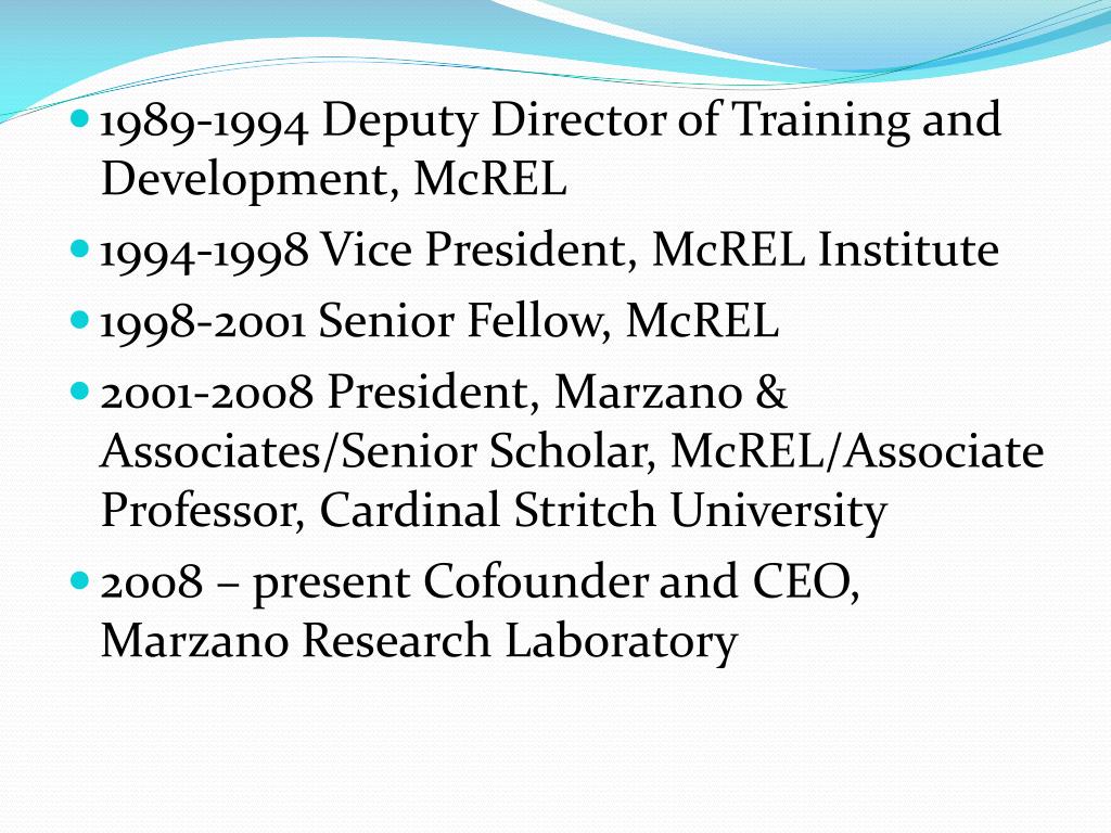 1989-1994 Deputy Director of Training and Development, McREL • 1994-1998 Vice President, McREL Institute • 1998-2001 Senior Fellow, McREL • 2001-2008 President, Marzano & Associates/Senior Scholar, McREL/Associate Professor, Cardinal Stritch University • 2008 – present Cofounder and CEO, Marzano Research Laboratory
