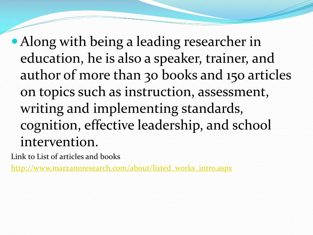 Along with being a leading researcher in education, he is also a speaker, trainer, and author of more than 30 books and 150 articles on topics such as instruction, assessment, writing and implementing standards, cognition, effective leadership, and school intervention. Link to List of articles and books http://www.marzanoresearch.com/about/listed_works_intro.aspx