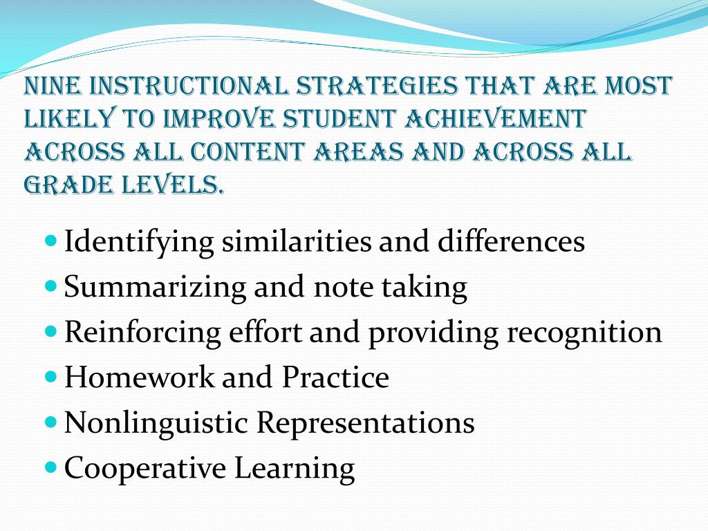 nine instructional strategies that are most likely to improve student achievement across all content areas and across all grade levels. • Identifying similarities and differences • Summarizing and note taking • Reinforcing effort and providing recognition • Homework and Practice • Nonlinguistic Representations • Cooperative Learning