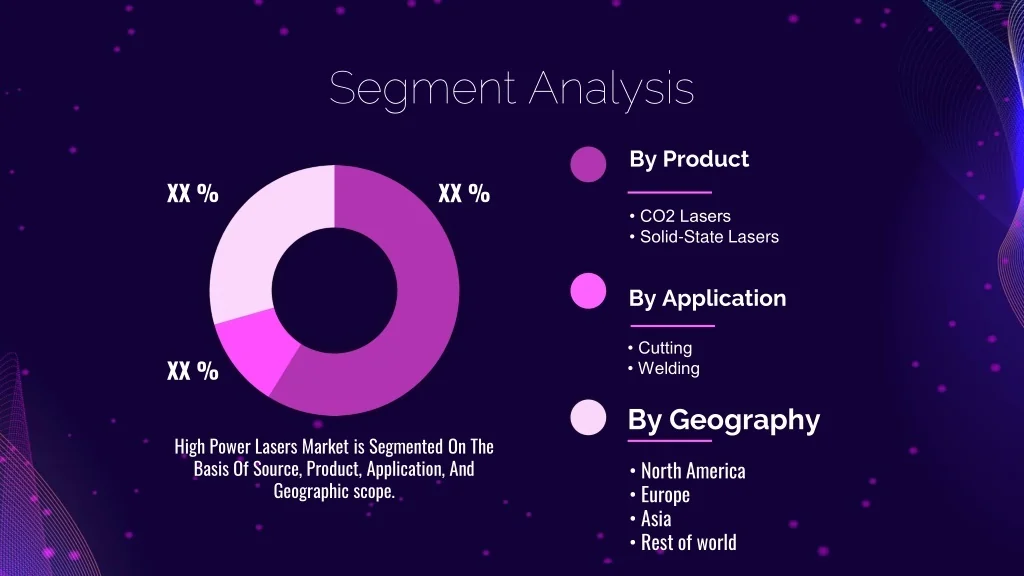 Segment Analysis By Product XX % XX % • • CO2 Lasers • • Solid-State Lasers • By Application • • Cutting • • Welding XX % • By Geography • High Power Lasers Market is Segmented On The Basis Of Source, Product, Application, And Geographic scope. • • North America • • Europe • • Asia • • Rest of world