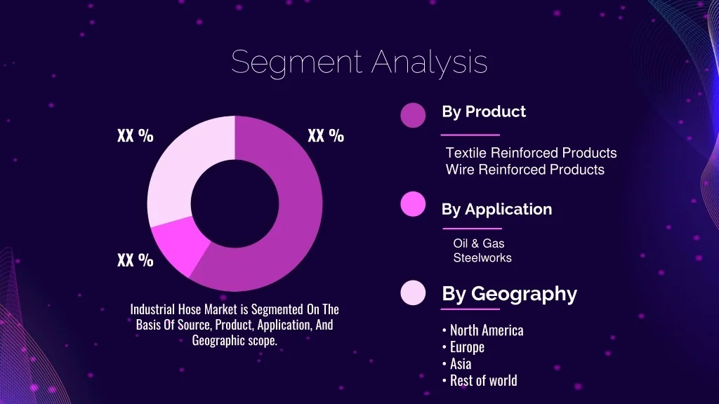 Segment Analysis By Product XX % XX % • Textile Reinforced Products • Wire Reinforced Products • By Application • Oil & Gas • Steelworks XX % • By Geography • Industrial Hose Market is Segmented On The Basis Of Source, Product, Application, And Geographic scope. • • North America • • Europe • • Asia • • Rest of world