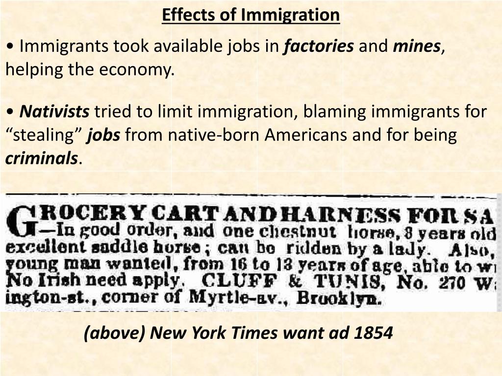 Effects of Immigration • Immigrants took available jobs in factories and mines, helping the economy. • Nativists tried to limit immigration, blaming immigrants for “stealing” jobs from native-born Americans and for being criminals. (above) New York Times want ad 1854