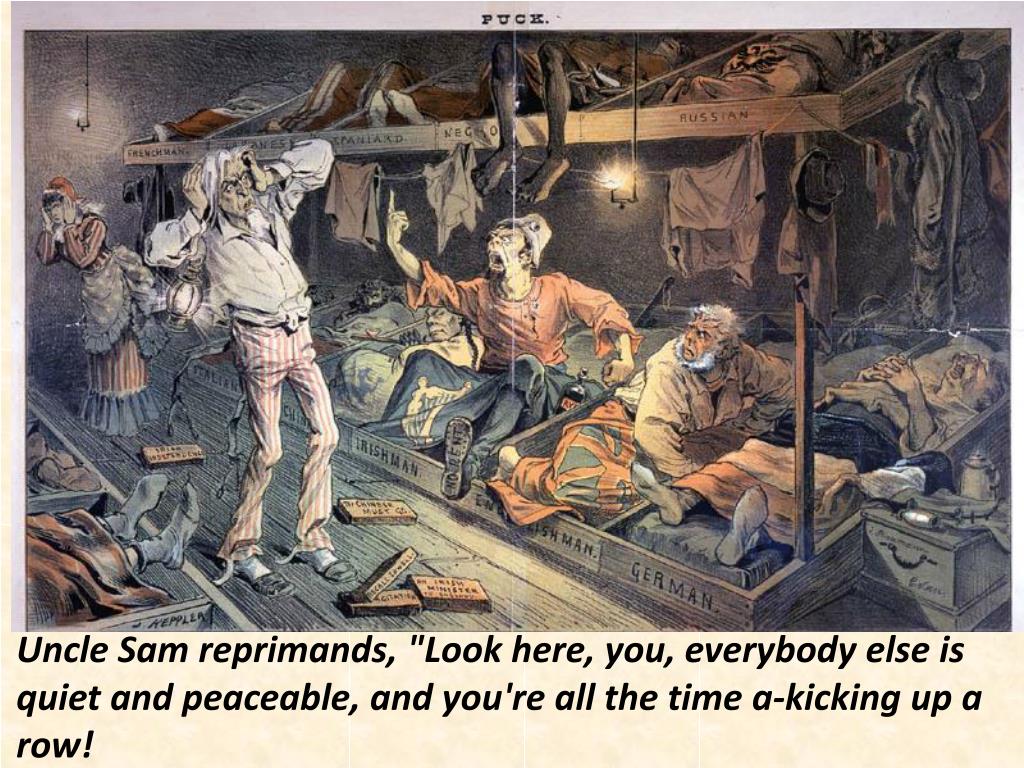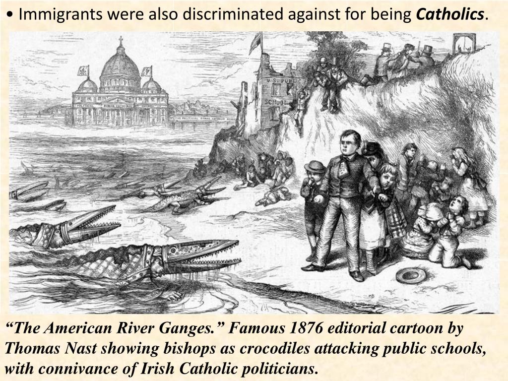 • Immigrants were also discriminated against for being Catholics. “The American River Ganges.” Famous 1876 editorial cartoon by Thomas Nast showing bishops as crocodiles attacking public schools, with connivance of Irish Catholic politicians.