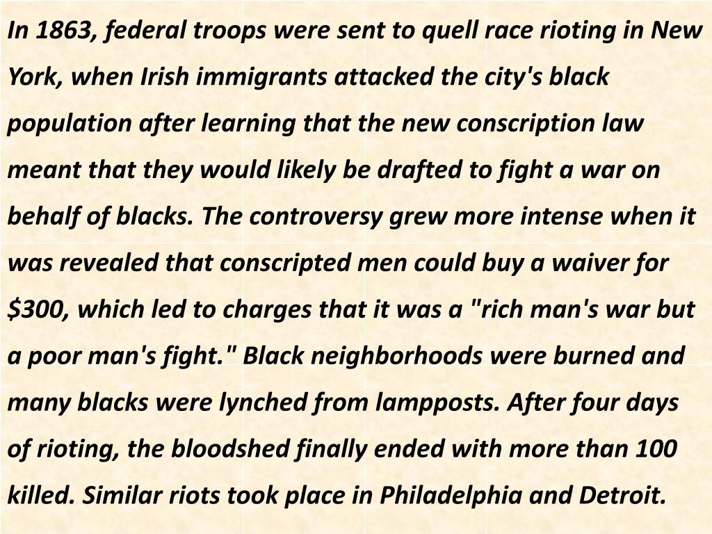 In 1863, federal troops were sent to quell race rioting in New York, when Irish immigrants attacked the city's black population after learning that the new conscription law meant that they would likely be drafted to fight a war on behalf of blacks. The controversy grew more intense when it was revealed that conscripted men could buy a waiver for $300, which led to charges that it was a "rich man's war but a poor man's fight." Black neighborhoods were burned and many blacks were lynched from lampposts. After four days of rioting, the bloodshed finally ended with more than 100 killed. Similar riots took place in Philadelphia and Detroit.