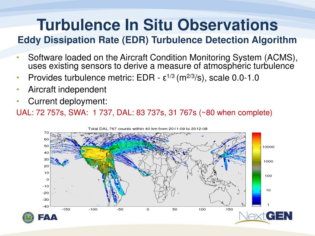 Turbulence In Situ ObservationsEddy Dissipation Rate (EDR) Turbulence Detection Algorithm Software loaded on the Aircraft Condition Monitoring System (ACMS), uses existing sensors to derive a measure of atmospheric turbulence Provides turbulence metric: EDR - ε1/3 (m2/3/s), scale 0.0-1.0 Aircraft independent Current deployment: UAL: 72 757s, SWA: 1 737, DAL: 83 737s, 31 767s (~80 when complete)