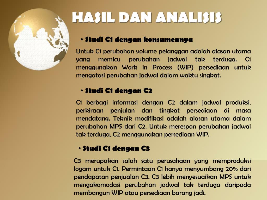 HASIL DAN ANALISIS • Studi C1 dengan konsumennya Untuk C1 perubahan volume pelanggan adalah alasan utama yang memicu perubahan jadwal tak terduga. C1 menggunakan Work in Process (WIP) persediaan untuk mengatasi perubahan jadwal dalam waktu singkat. • Studi C1 dengan C2 C1 berbagi informasi dengan C2 dalam jadwal produksi, perkiraan penjulan dan tingkat persediaan di masa mendatang. Teknik modifikasi adalah alasan utama dalam perubahan MPS dari C2. Untuk merespon perubahan jadwal tak terduga, C2 menggunakan persediaan WIP. • Studi C1 dengan C3 C3 merupakan salah satu perusahaan yang memproduksi logam untuk C1. Permintaan C1 hanya menyumbang 20% dari pendapatan penjualan C3.C3 lebih menyesuaikan MPS untuk mengakomodasi perubahan jadwal tak terduga daripada membangun WIP atau persediaan barang jadi.