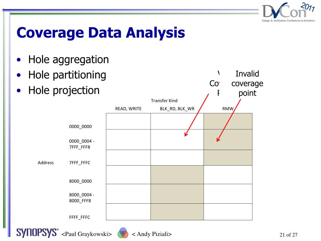 Hole Partitioning • Block and atomic transfers to end regions prohibited • Coverage holes that are semantically similar are coalesced into a single region • <{{BLK_RD,BLK_WR}, 0000_0000}, {RMW, FFFF_FFFC}> <Paul Graykowski> < Andy Piziali>