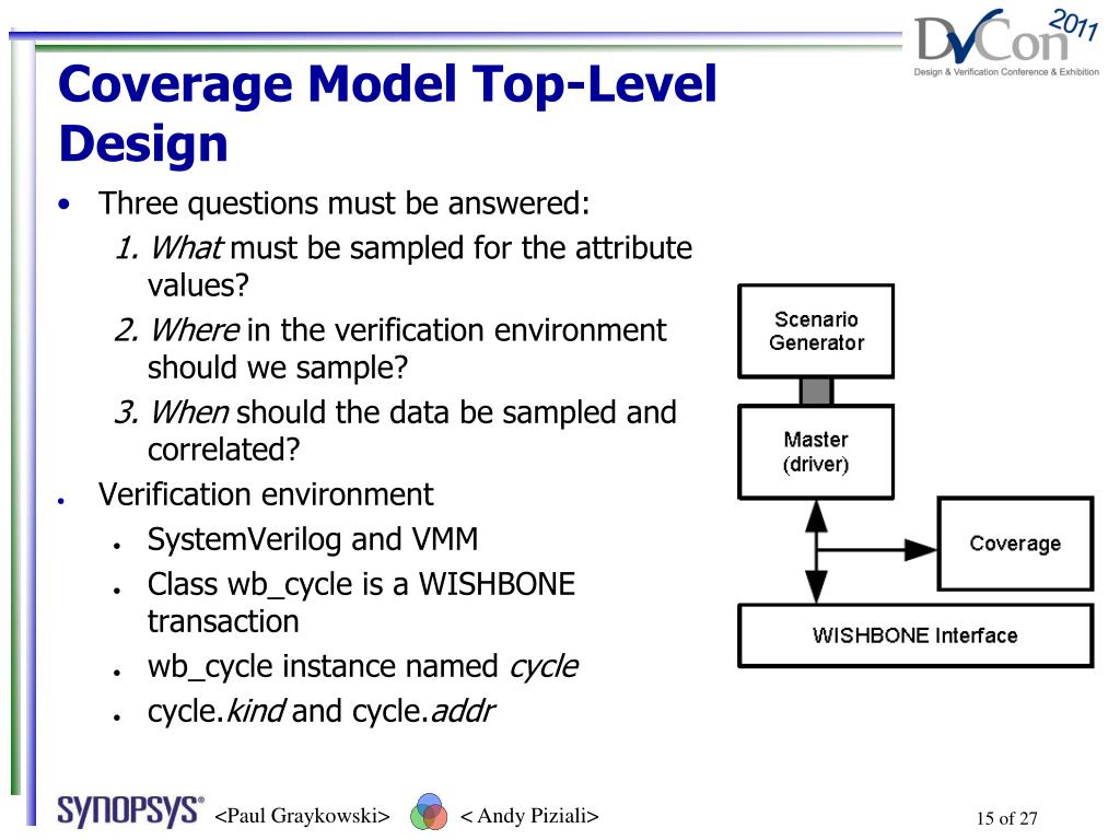 Coverage Model Top-Level Design • Three questions must be answered: • What must be sampled for the attribute values? • Where in the verification environment should we sample? • When should the data be sampled and correlated? • Verification environment • SystemVerilog and VMM • Class wb_cycle is a WISHBONE transaction • wb_cycle instance named cycle • cycle.kind and cycle.addr <Paul Graykowski> < Andy Piziali>