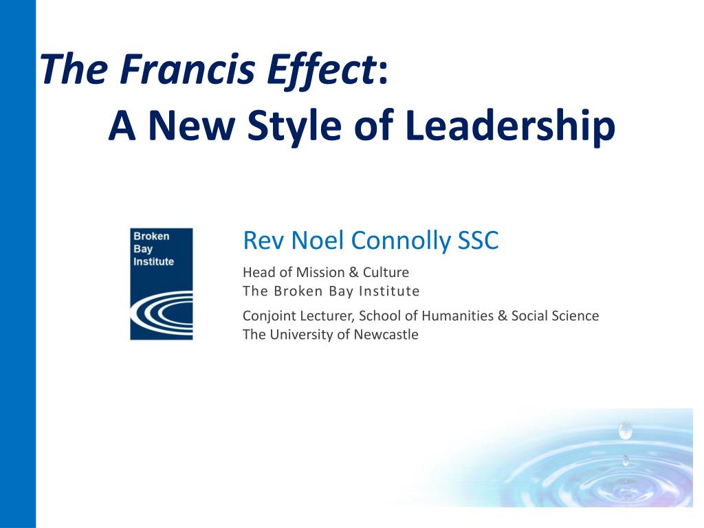 The Francis Effect: A New Style of Leadership Rev Noel Connolly SSC Head of Mission & Culture The Broken Bay Institute Conjoint Lecturer, School of Humanities & Social Science The University of Newcastle