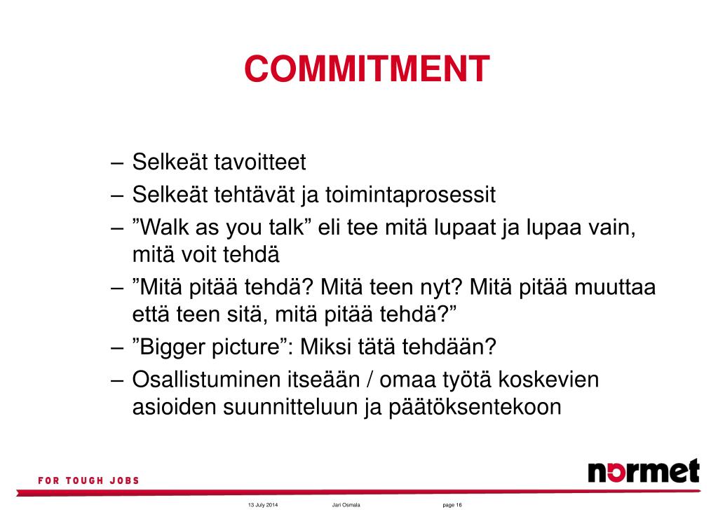COMMITMENT • Selkeät tavoitteet • Selkeät tehtävät ja toimintaprosessit • ”Walk as you talk” eli tee mitä lupaat ja lupaa vain, mitä voit tehdä • ”Mitä pitää tehdä? Mitä teen nyt? Mitä pitää muuttaa että teen sitä, mitä pitää tehdä?” • ”Bigger picture”: Miksi tätä tehdään? • Osallistuminen itseään / omaa työtä koskevien asioiden suunnitteluun ja päätöksentekoon Jari Osmala